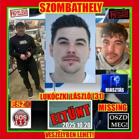 Aggódva keresik a családtagjai és a barátai a 31 éves Lukóczki Lászlót. Az eltűnt férfinak még október 20-án, hétfő este veszett nyoma Szombathelyen, ahol a Puskás Tivadar utcában látták utoljára. Azóta nem adott életjelet magáról, a telefonja ki van kapcsolva, és nincs biztos információ a hollétéről.