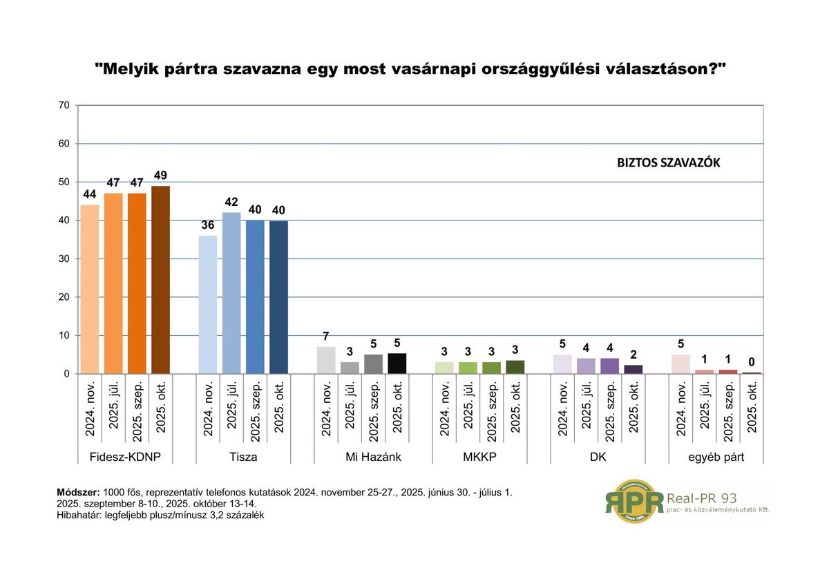 A Real-PR 93. közvélemény-kutatása alapján Magyar Péter pártjának változatlan támogatottsága (40 százalék) mellett a kormánypártok erősödtek a pártok versenyében, miközben a Mi Hazánk épp a bejutási küszöbön áll (5 százalék) október közepén. Más párt nem jutna a parlamentbe a kutatás szerint.