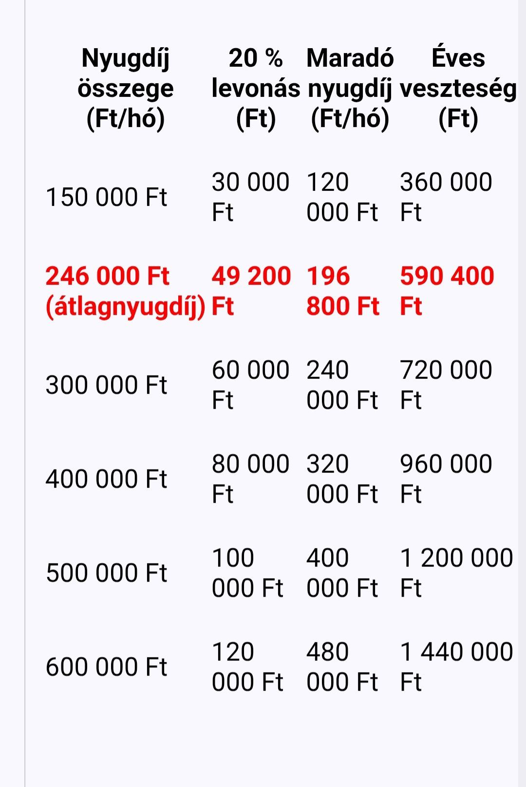 A 300 ezres nyugdíjnál ugyanez 60 ezer és 720 ezer, a 400 ezresnél 80 ezer és 960 ezer, az 500 ezresnél 100 ezer és 1,2 millió forint, míg a 600 ezresnél 120 ezer és 1,44 millió forint lenne az az összeg, amit elbukna a nyugdíjas.