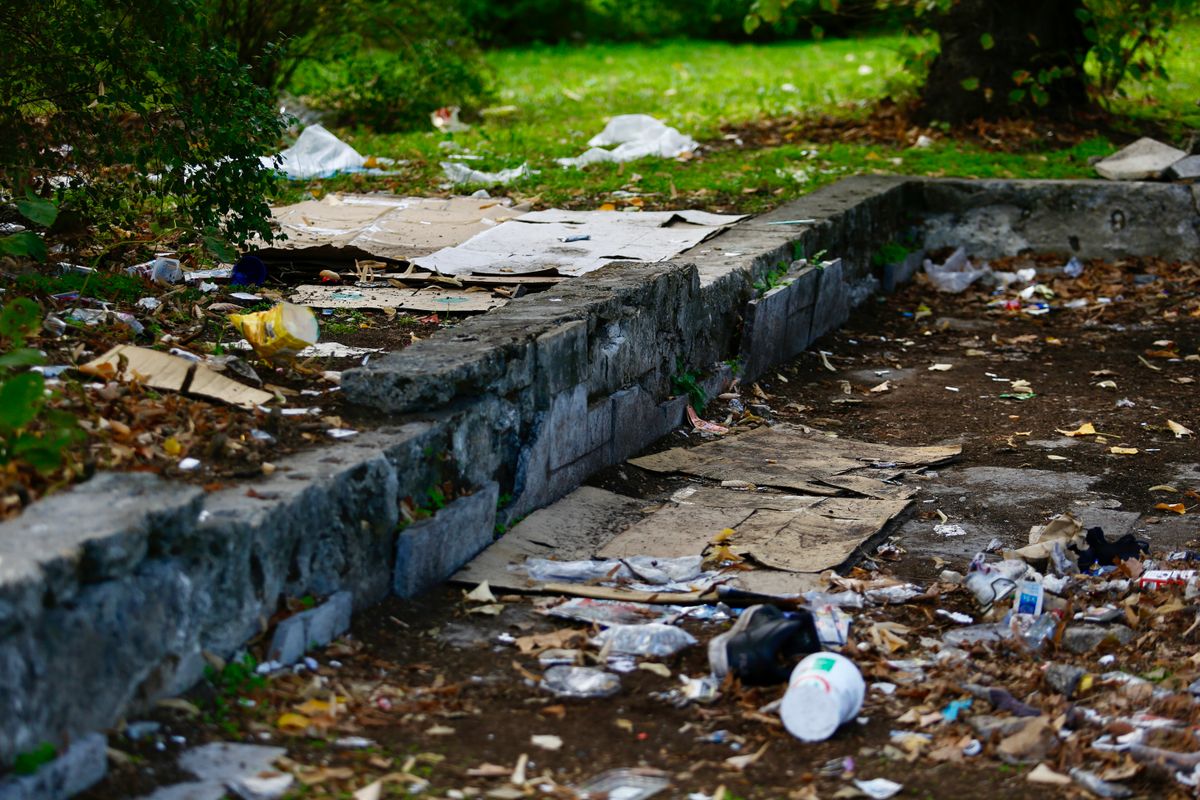 Jól látható, hogy többen itt élik a mindennapjaikat. Fagyis és ételes doboz, pohár, ruhák és dohányzacskó. Ezek mind a földön hevernek.