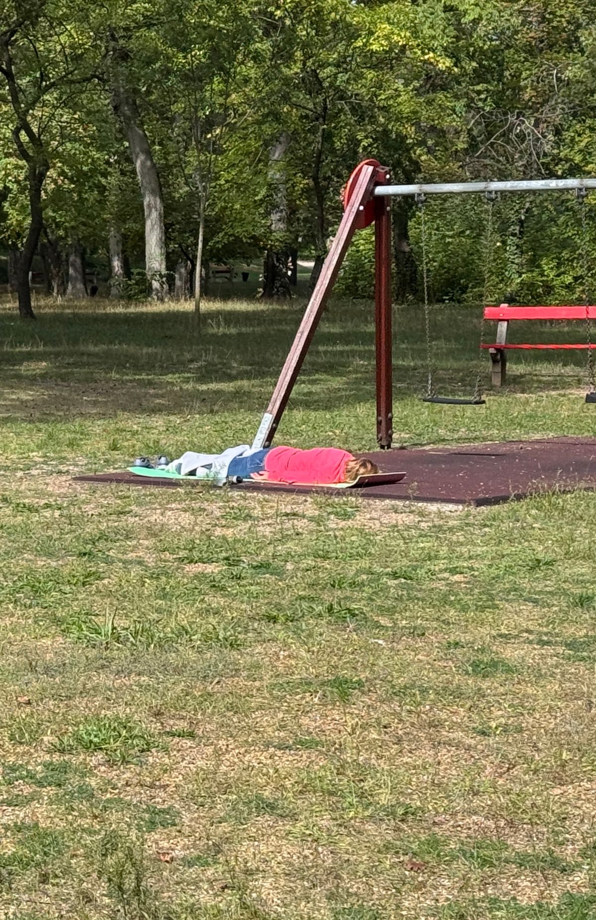 Fényes nappali szieszta a jó időben. Nem ritka látvány ez a Népligetben. A hinta a háttérben valóban csupán látványelem. Ki ültetné felé ide a gyerekét?