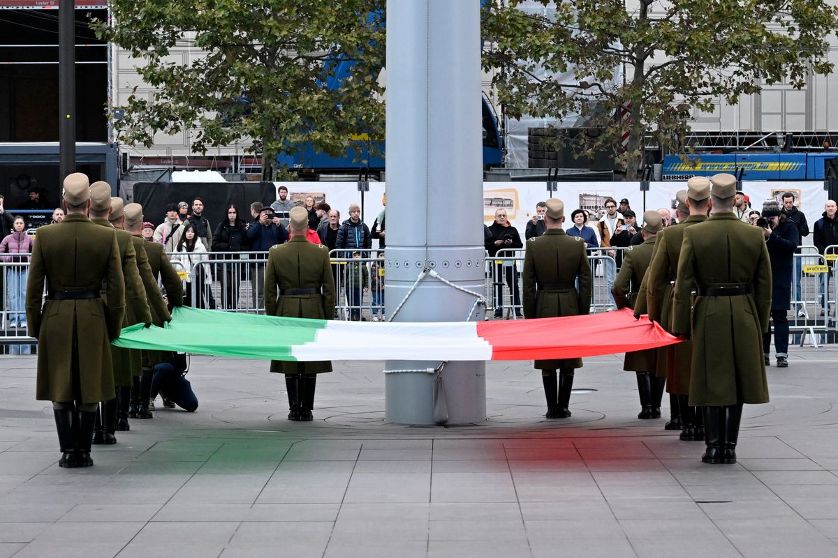 Katonai tiszteletadással, Szalay-Bobrovniczky Kristóf honvédelmi miniszter és Böröndi Gábor vezérezredes, a Honvéd Vezérkar főnöke jelenlétében felvonták a nemzeti lobogót az 1956-os forradalom és szabadságharc 69. évfordulóján, csütörtök reggel Budapesten, az Országház előtti Kossuth Lajos téren.