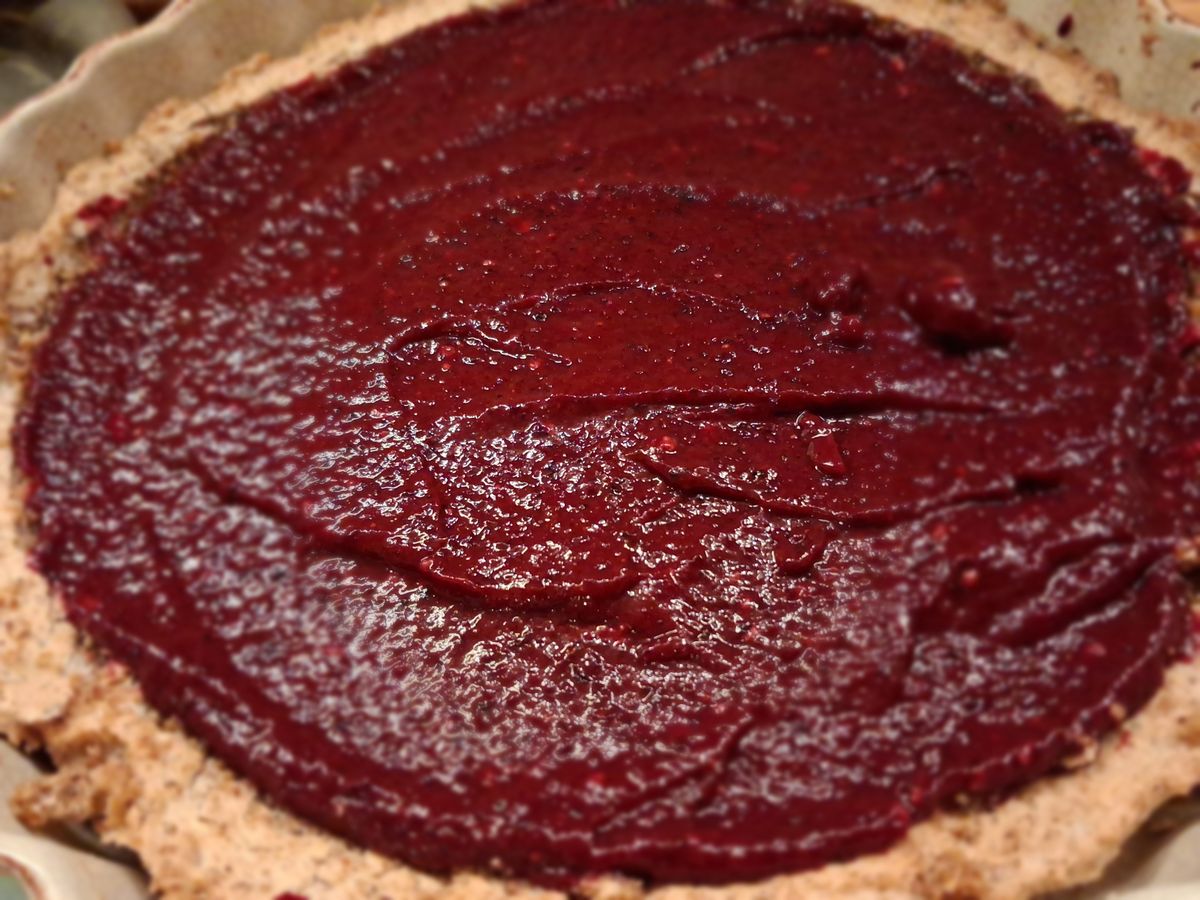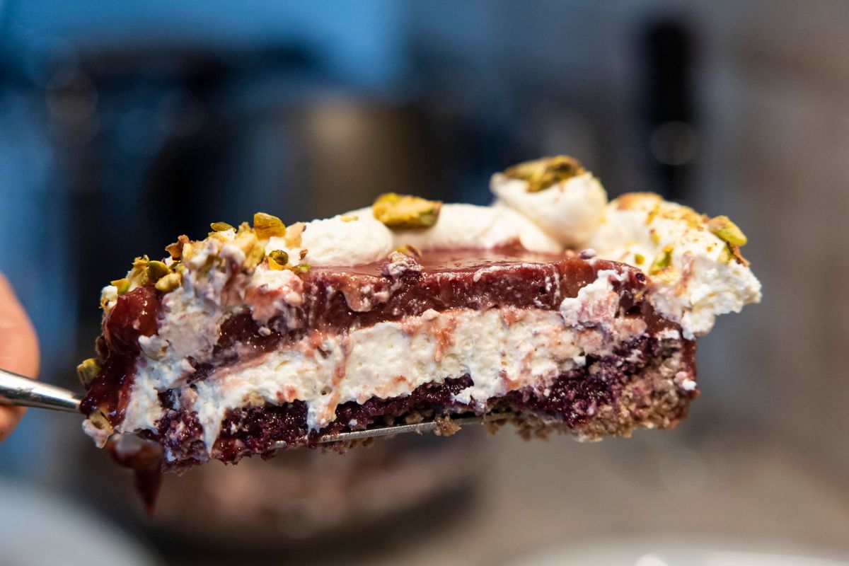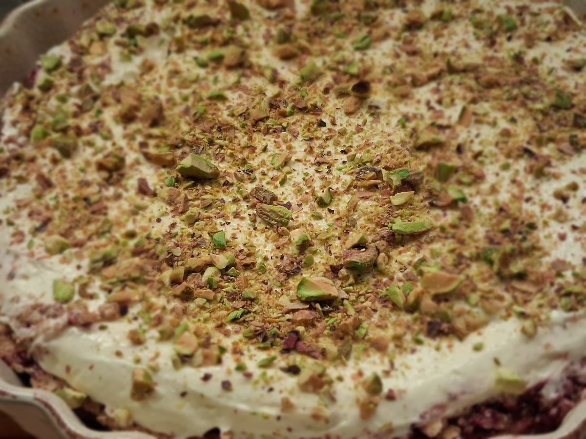 Erre rákenjük a házi szilvavelő felét, amire visszaszórjuk a tészta morzsalékát, majd jöhet a fehér krém fele, erre a pisztácia őrlemény fele, majd ismét a szilvavelő. A piros tetejére nyomózsákkal formázva tesszük rá a mascarponés krém másik felét, úgy, hogy látható maradjon a piros szín. Végül a fehér krémmintát megszórjuk pisztáciadarával.