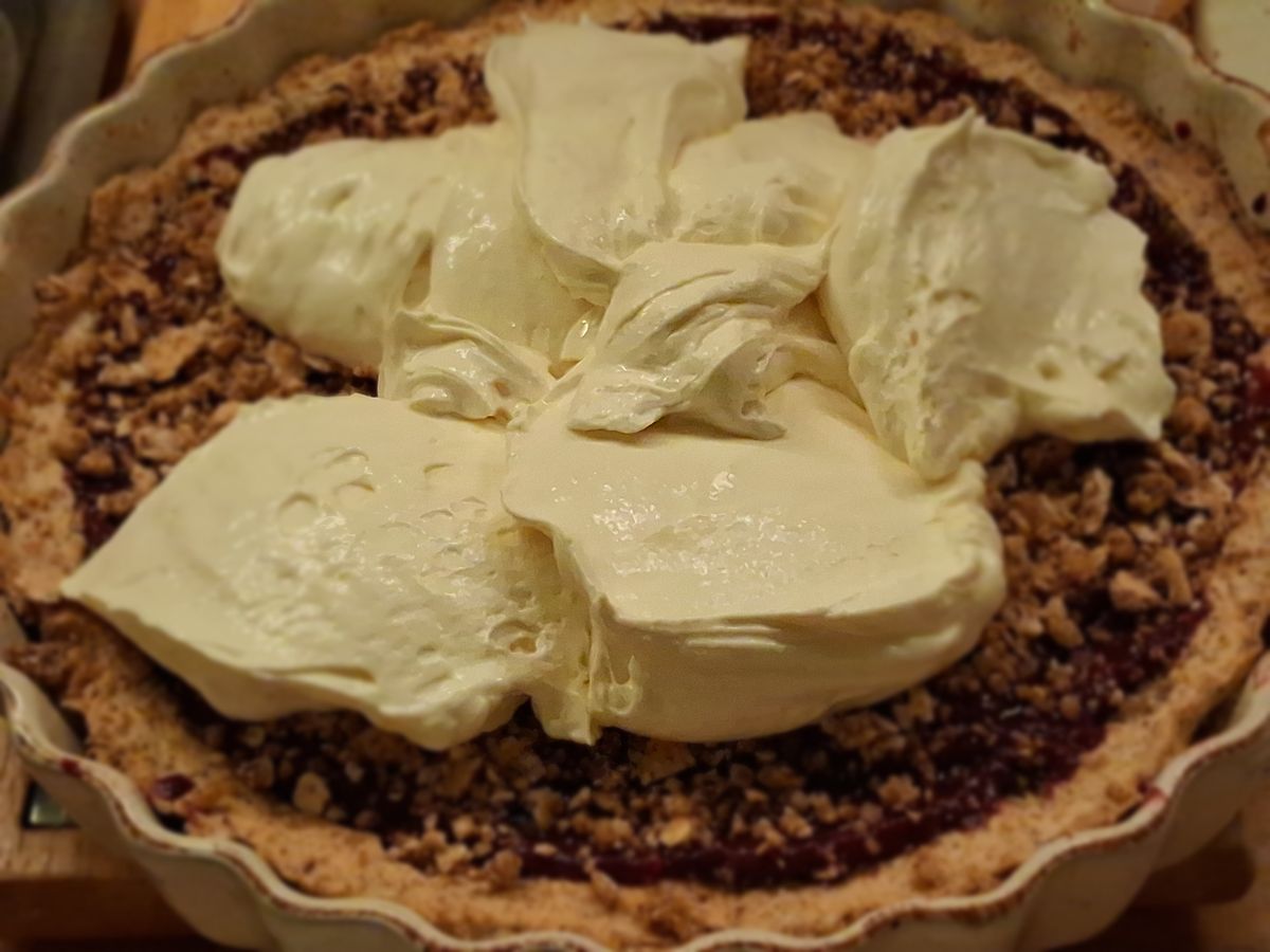 Közben a mascarponét a tejföllel habosra keverjük, minimális nyírfacukor hozzáadásával. (Ha elég édes a szilvasűrítmény, akkor egyáltalán nem kell hozzá plusz cukor.) Ha kész a tészta, kivesszük a sütőből, a ropogós tetejét kiskanállal lekaparjuk, és a morzsalékot félretesszük egy tálba.