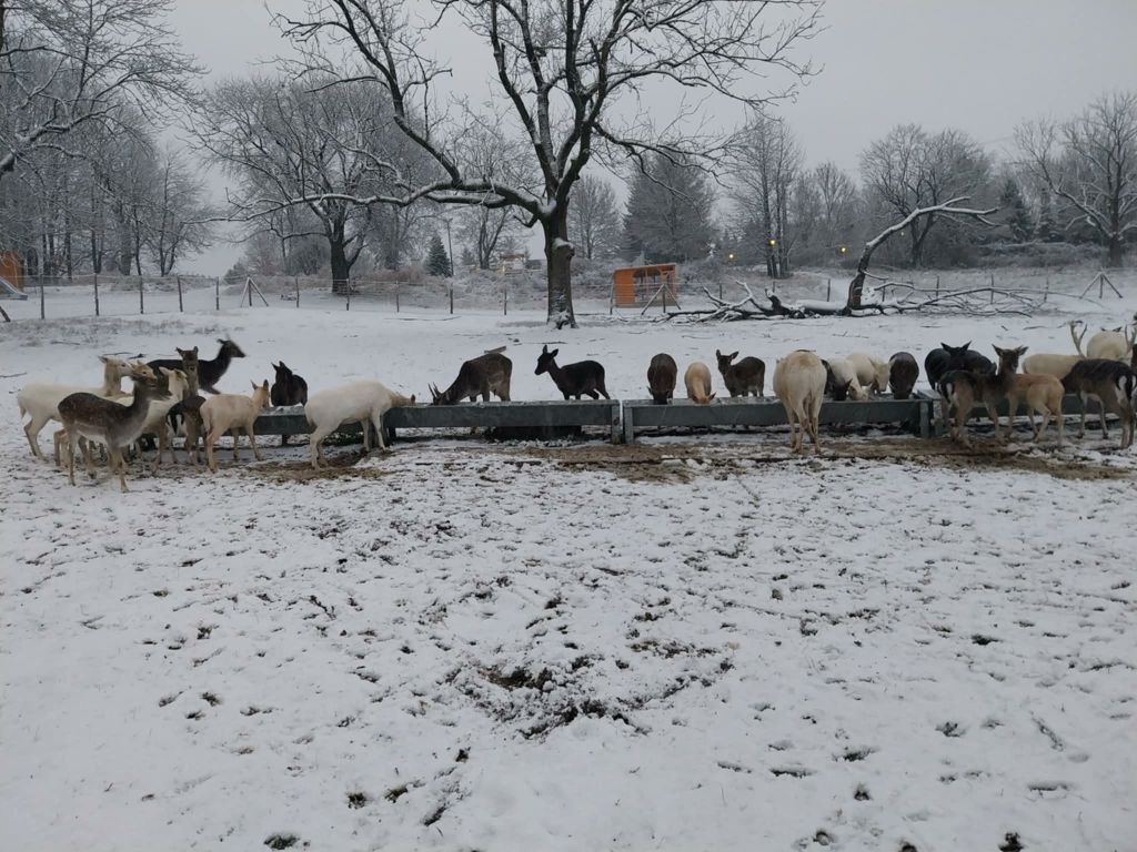 A Szarvaskúti Dámfarm gazdái pénteken mesés reggeli tájat tudtak megörökíteni, a szarvaskúti dámszarvasok hóesésben reggeliztek.