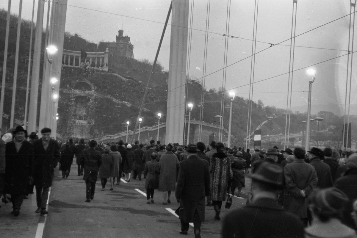 A megnyitást eredetileg 1964. november 7-re – a rendszer egyik ünnepnapjára – tervezték, de a munkálatok csúsztak. Végül november 21-én adták át a forgalomnak az új Erzsébet hidat, előző nap azonban egy különleges alkalom tette felejthetetlenné az eseményt: több tízezer ember gyalogolhatott végig rajta, mielőtt birtokba vették volna az autók és a villamosok. A történelmi pillanatot a televízió is élő adásban közvetítette.