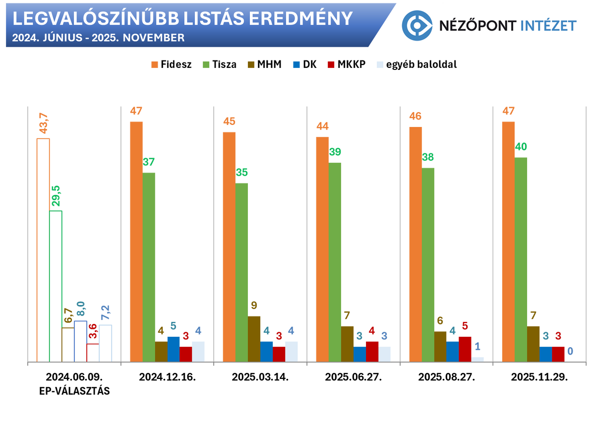 Ha most vasárnap tartanának választást Magyarországon, a Fidesz 47, a Tisza 40 százalékos eredményt érne el a Nézőpont Intézet novemberi közvélemény-kutatása szerint.