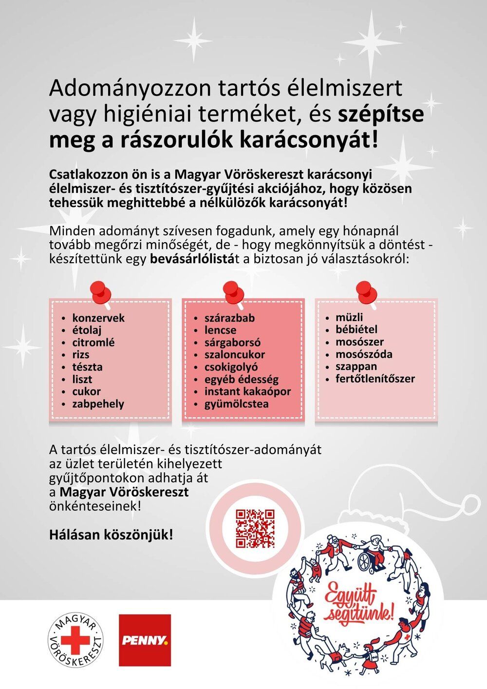 Budapesten 12 Penny áruházban várják a lelkes önkéntesek és a Vöröskereszt munkatársai a tartós élelmiszer, édesség, valamint tisztító- és tisztálkodási szerek felajánlásait: