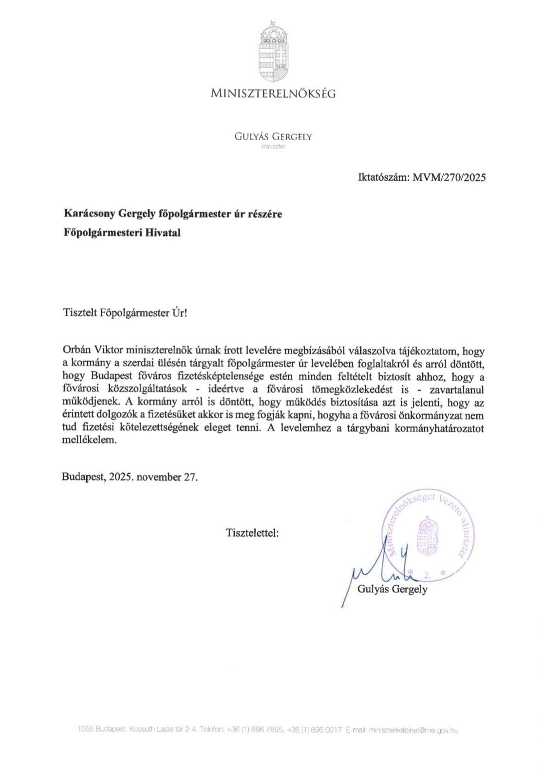 A kormány határozatban szögezte le, hogy Karácsony Gergely fizetésképtelenné válása esetén is fizeti a fővárosi dolgozók bérét és biztosítja a közszolgáltatásokat is. A főpolgármesternek az lenne a dolga, hogy vállalja a felelősséget és a megoldáson dolgozzon, ne pedig politikai színjátékot rendezzen és tüntetést szervezzen.
