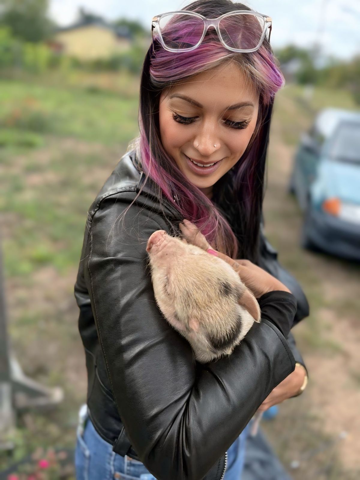 A minnesotai törpemalac kisebb, mint a hagyományos sertés, de így is 80 kilóra megnő nagykorára. Alice még babamalac, hiszen idén augusztus 14-én született. Igazi kislány, mondja Camilla: akaratos, de nagyon cuki.