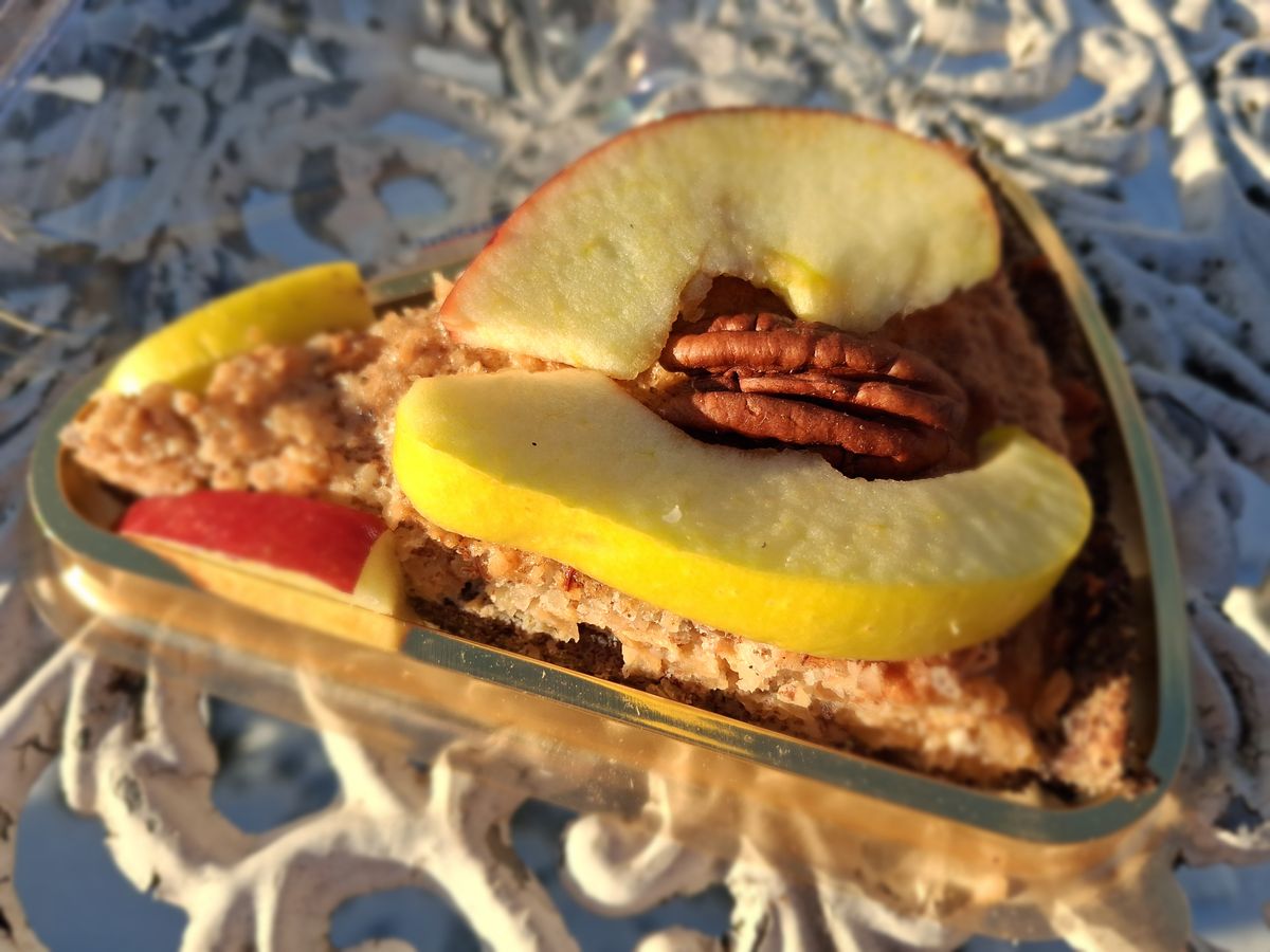 Ha már nem forró a süti és összeálltak kicsit a rétegek, felszeletelve tálaljuk. A szeletek közé piros és sárga elválasztó almaszeleteket teszünk, tetejét magokkal dekorálhatjuk.