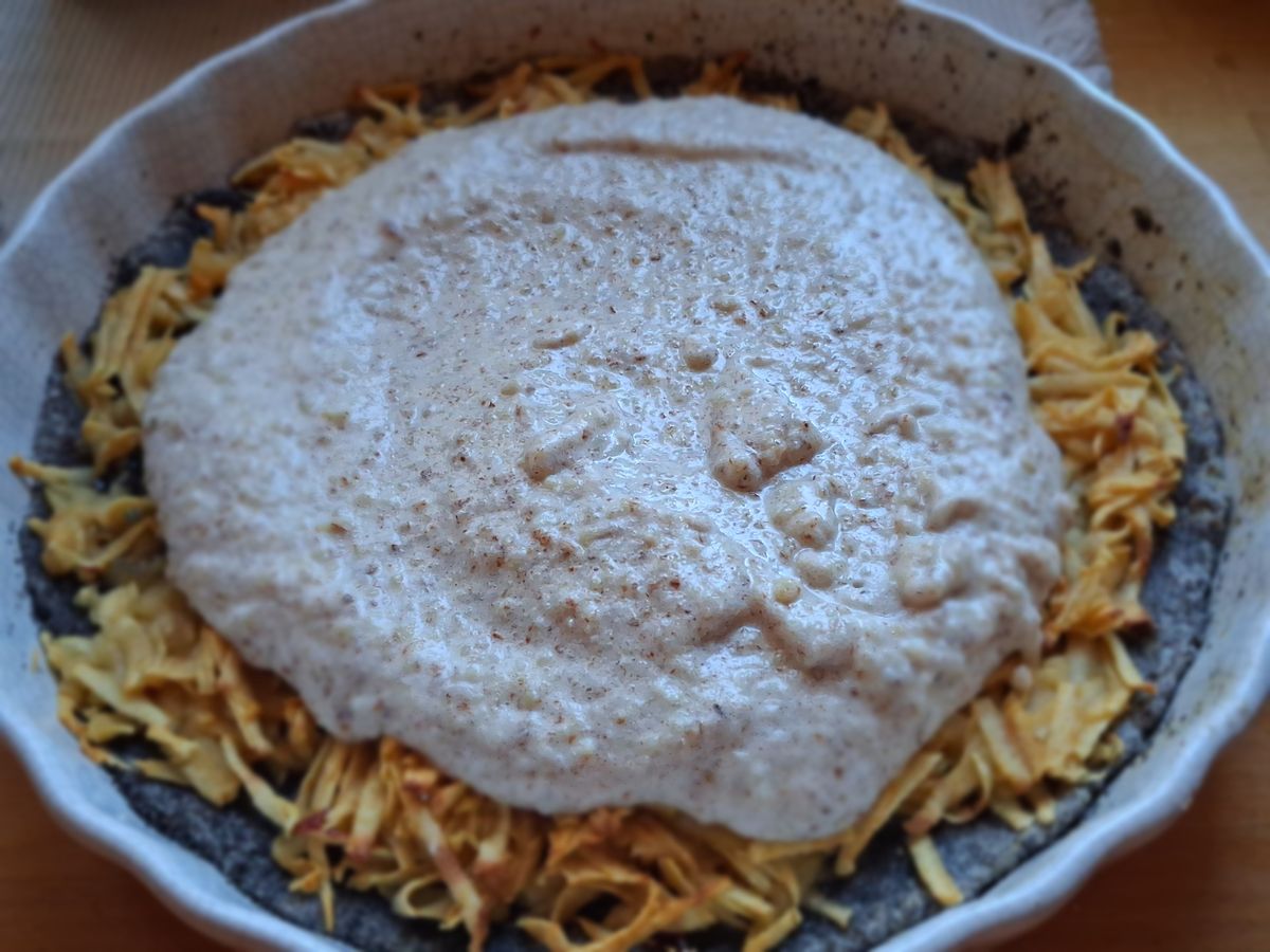Villával megszurkáljuk és légkeveréssel 180 fokon elősütjük, kb 15 percig. Ezután ráreszeljük a tésztára az almát és vagy cukorral hintjük meg a tetejét, vagy mézet csorgatunk rá, ízlés szerint. Így visszatesszük a sütőbe, de csak 140 fokon. Közben – 1-2 kanál cukor/eritrit hozzáadásával - habbá verjük a tojásfehérjét, majd belekeverjük a darált magokat, hozzáadva a narancs kifacsart levét. Amikor ez kész, kivesszük a sütőből a reszelt almás mákos tésztát és ráterítjük a habos-magos narancsos öntetet. Ezzel együtt átsütjük 160 fokon légkeveréssel, amíg a teteje és az alja is meg nem sül (kb 25-30 perc). Vigyázzunk, hogy szaftos maradjon a süti, ne száradjon ki.