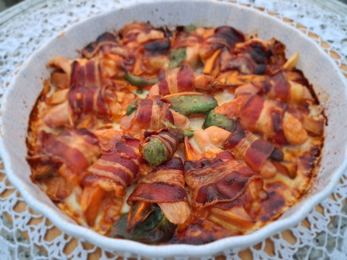 Ha marad baconszelet, azt csak úgy dobjuk rá kisülni az egész rolórakomány tetejére. Ha batáta is marad, azt ugyancsak beledobálhatjuk a sütőtálba, és annak a tetejére csavarjuk a baconszeletet.