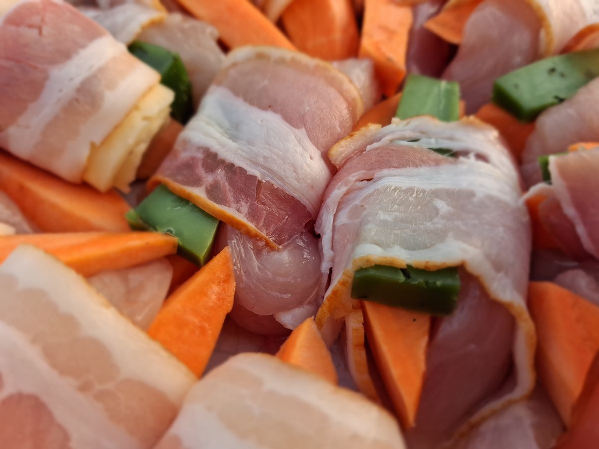 Ezután egyesével kiterítjük egy deszkán a baconszeleteket (ha kicsi rolókat szeretnénk, felezhetjük a szeleteket), mindegyikbe beleteszünk egy csibemell csíkot, egy batáta gerezdet és egy sajtrudacskát, majd feltekerjük.