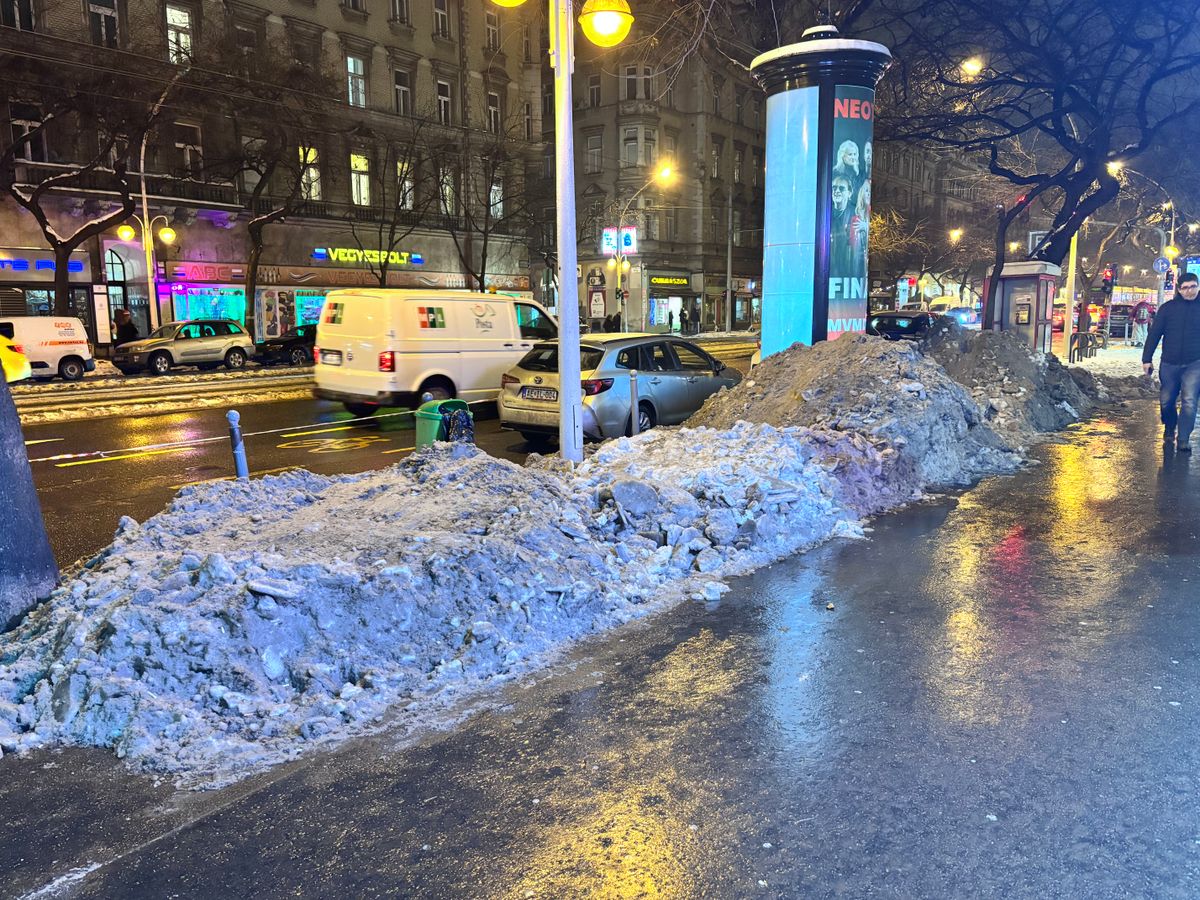 Ha itt-ott feltűnnek a hókotrók, hatalmas hókupacokat építenek. Egy nyugdíjas férfi, K. Ernő mérgesen készített fotókat január 15-én, csütörtökön az egyik mesterművükről. Az Erzsébet körút-Király utcai villamosmegálló közelében több méteres „hószörny” pihen a járda szélén, szorosan a bicikliútnál.