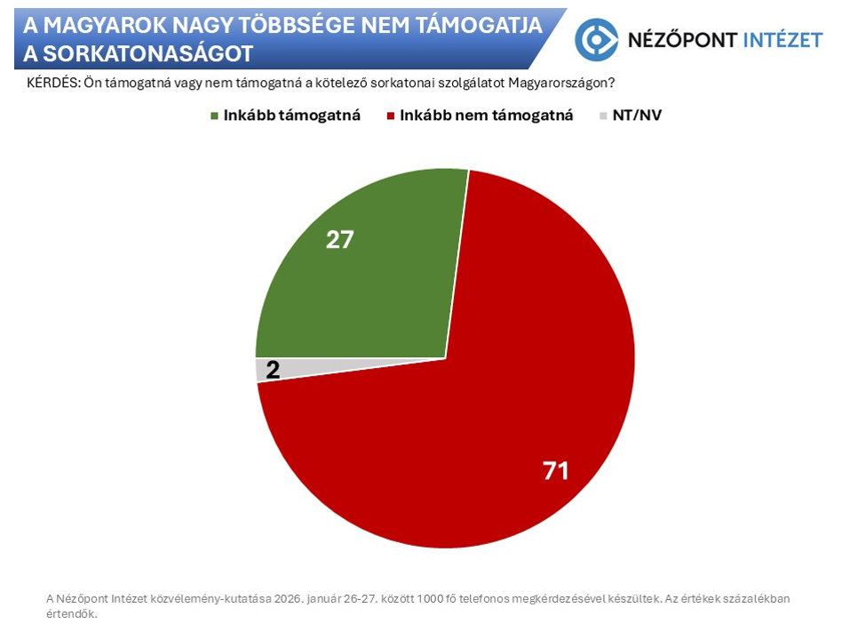 A Nézőpont Intézet közvélemény-kutatásban vizsgálta meg a sorkatonaság esetleges visszaállításának társadalmi megítélését Magyarországon. Az eredmény egyértelmű népszerűtlenséget mutat a magyarok körében, hiszen a teljes választókorú népesség több mint 70 százaléka nem támogatná a kötelező sorkatonai szolgálat bevezetését, sőt a kutatás nem talált olyan társadalmi csoportot, ahol ne lenne legalább kétharmados elutasítottsága ennek az intézkedésnek. Ezzel szemben a választók egynegyede egyetértene a sorkatonaság visszaállításával és mindössze két százaléknyian nem tudnak vagy akarnak állást foglalni a kérdésben.