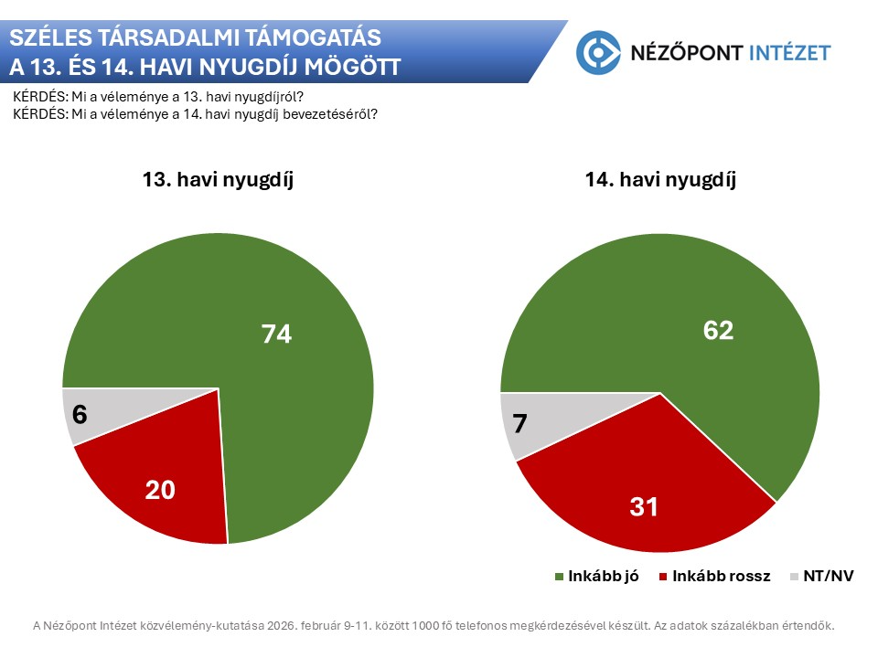 A 13. és 14. havi nyugdíjról a teljes felnőtt népesség nagy többsége van jó véleménnyel (74 és 62 százalék) és mindössze 20, illetve 31 százalék a nem támogatók aránya. 6 valamint 7 százalék pedig nem tudott vagy akart válaszolni a kérdésben.
