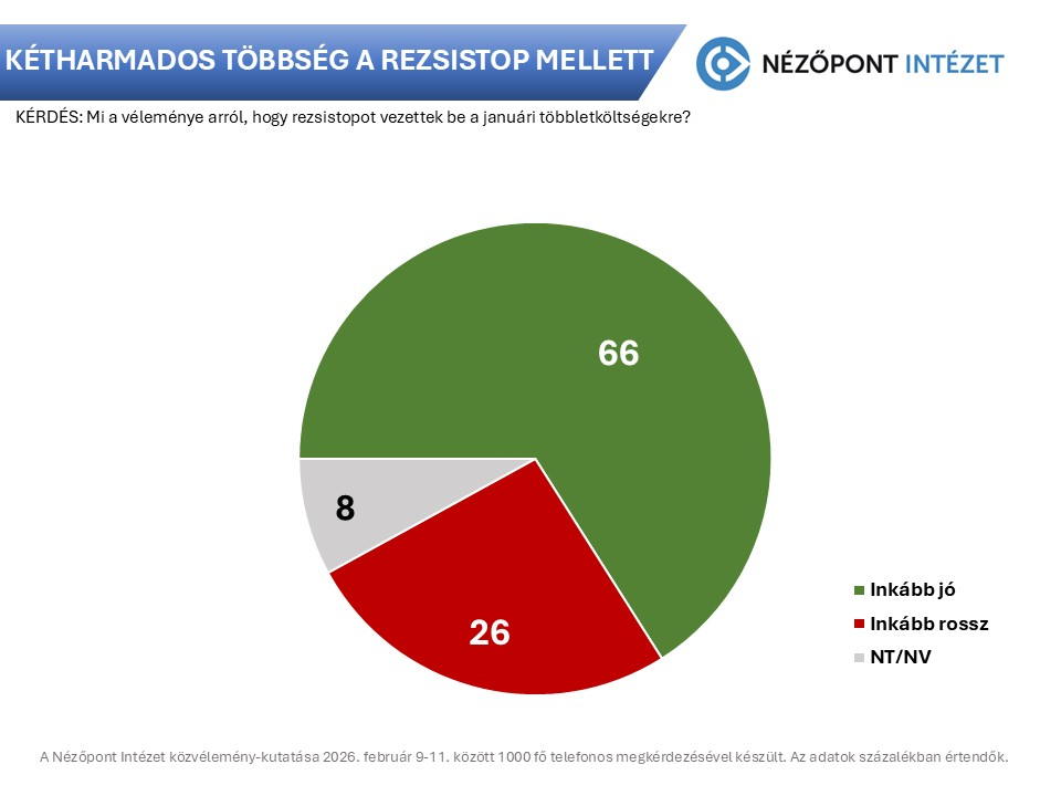 Hasonló arányokat talált a kutatás a rezsistop esetében, aminek pontosan kétharmados a támogatottsága, és csupán a magyarok negyede (26 százalék) van inkább rossz véleménnyel róla, és 8 százalék a bizonytalanok aránya.