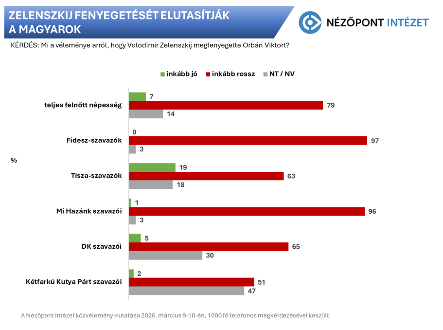 Az ukrán elnök nem népszerű a magyarok körében (64 százalékának rossz a véleménye róla), a kormányfőnek címzett fenyegetését négyötödük (79 százalék) elutasítja, az ukrán készpénz-szállítmány átvizsgálását csak harmaduk ellenzi (35 százalék) – ez derül ki a Nézőpont Intézetnek az MTVA-val együttműködésben készített március eleji közvélemény-kutatásából.