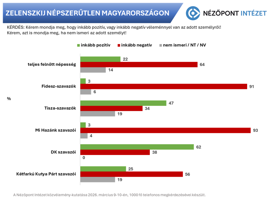 A példátlan kirohanás érezhető Volodimir Zelenszkij elnök magyarországi népszerűségén is. A választókorú magyarok 64 (a Fidesz-szavazók 91) százalékának inkább negatív képe van az ukrán elnökről és csak 22 százalékának pozitív. A Tisza Párt szavazói azonban megosztottak a kérdésben: közel felük (47 százalék) szimpatizál Ukrajna elnökével, harmaduk (34 százalék) azonban nem.