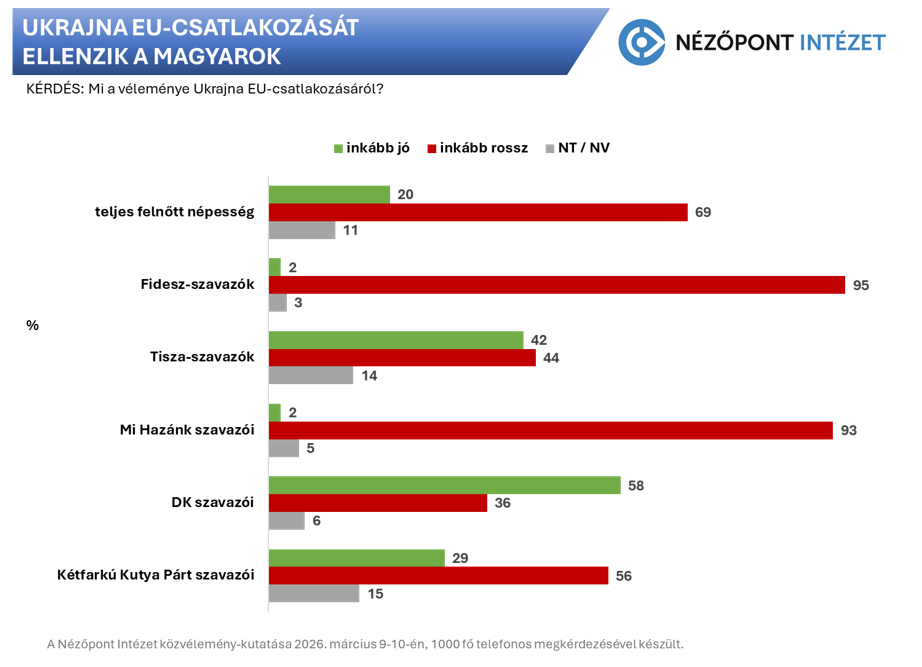 A Tisza Párt tavalyi aláírásgyűjtési akciójának eredményéhez hasonlóan szavazói most is megosztottak, de 42 százalékuk támogatja és csak 44 százalék ellenzi (a többiek nem tudtak vagy akartak válaszolni) a háborúban álló keleti szomszédunk felvételét az Európai Unióba.