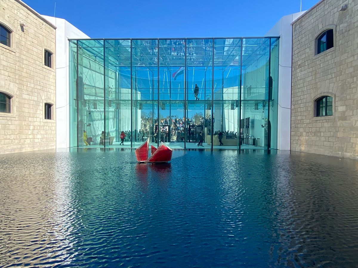 A kiállítás fogadóterének meghatározó eleme egy többrétegű, ragasztott üvegből készült szerkezet, amely kiemelkedő mérnöki megoldást képvisel. A fogadótéren átívelő, teljes egészében üvegből készült gyalogoshíd nemcsak szerkezeti, de esztétikai szempontból is különleges, mivel az üveg, mint elsődleges teherhordó anyag alkalmazása ebben a formában ritkaságszámba megy az építészetben. Az üvegcsarnokot vizuálisan és tartalomvilágában is erősíti a mögötte elhelyezkedő, az egykori rondellaudvarban létrehozott feszített víztükör, amelynek középpontjában egy öröklángot helyeztek el. Az öröklánggal a magyar történelem szabadságért küzdő hőseinek állítottak emléket.
