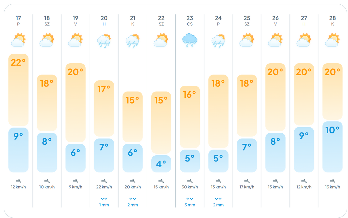 A Köpönyeg.hu előrejelzései szerint a hétvégi időhöz képest hidegebb lesz, kedden, szerdán és csütörtökön csak 15–16 fok lesz a maximális nappali hőmérséklet. Csütörtökön és pénteken előfordulhatnak záporok, hét vége felé pedig már újra kisüthet a nap.