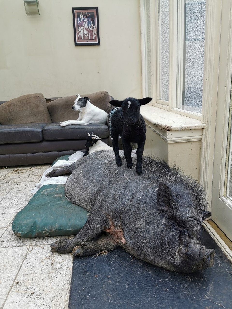 Hiába lett 127 kilós, továbbra is bent lakik a házban, jobbára a nappaliban hever egész nap. Gazdái egy hatalmas farmot üzemeltetnek, ahol az egyik kisbárány elárvult. Őt is bevitték a házba, hogy felerősítsék, a barika pedig pótanyának választotta az óriási disznót.