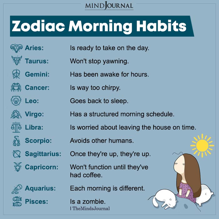 Horoszkópod alapján következtetni lehet a napi rutinodra, így egyértelmű, hogy azonnal egy kávéra van szükséged vagy akár órákba is beletelik, míg magadhoz térsz – írja a themindsjournal.com.