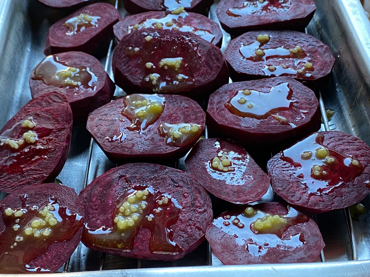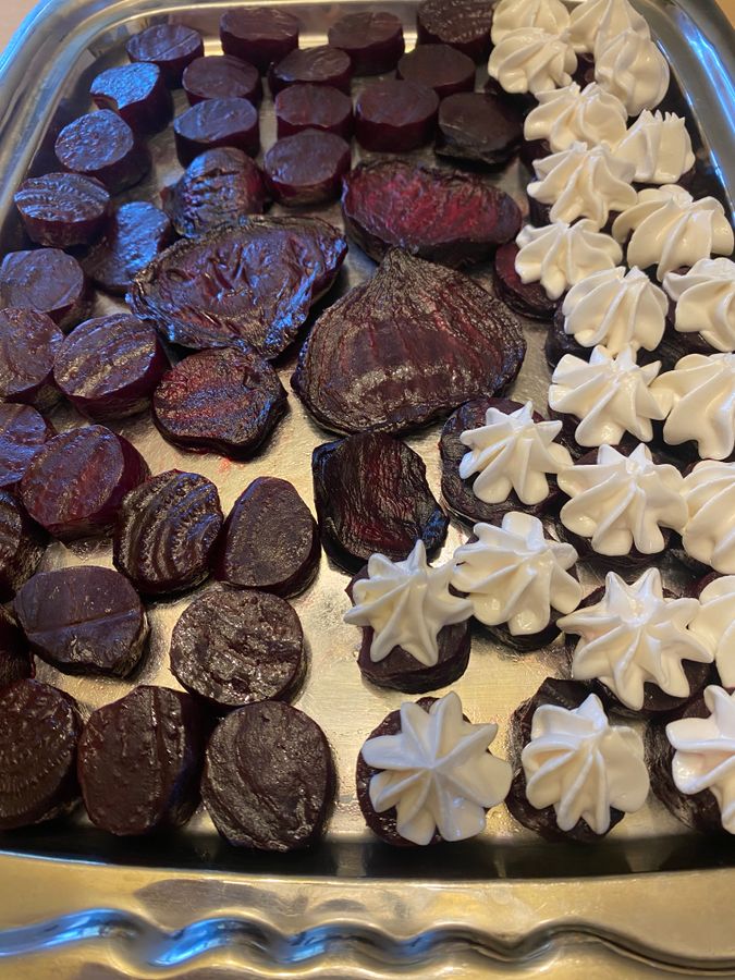Király Roland kovászos kenyerei mellé én készíthettem a hozzávalókat egy találkozóra. A vendéglátáshoz a jól bevált pecsenyekacsamáj-és padlizsánkrém mellett csibefalatok és kecskesajtos sültcékla-mignon is készült. A kenyérre való kencék persze vitték a prímet – ilyen kovászos kenyérrel nem csoda -, ezúttal azonban az önmagában édes-sós sültcékla-mignon receptjét osztjuk meg, ami a vártnál is nagyobb sikert aratott. A cékla édessége és a kecskesajt sóssága meglepően harmonikus, üde ízvilágot ad.