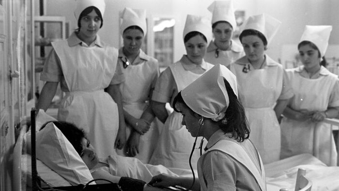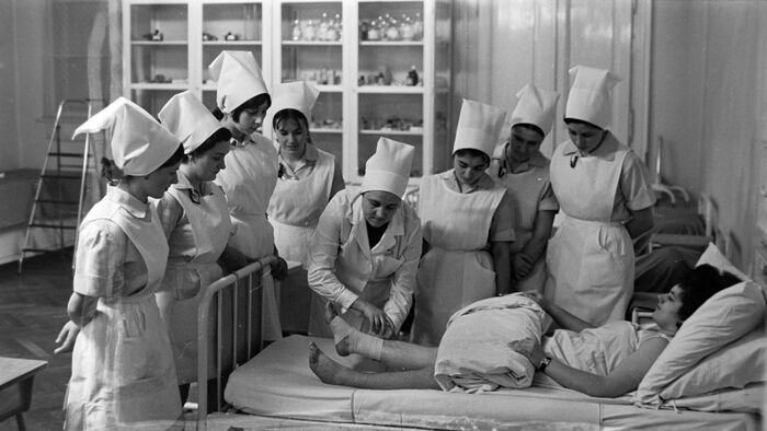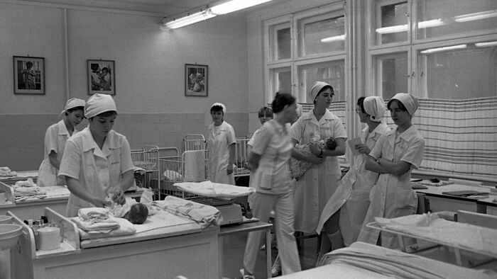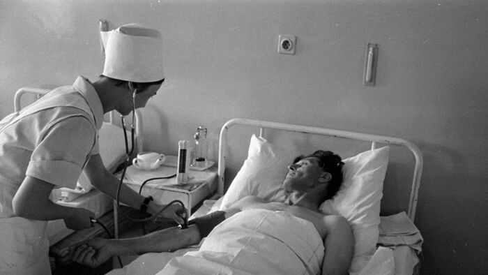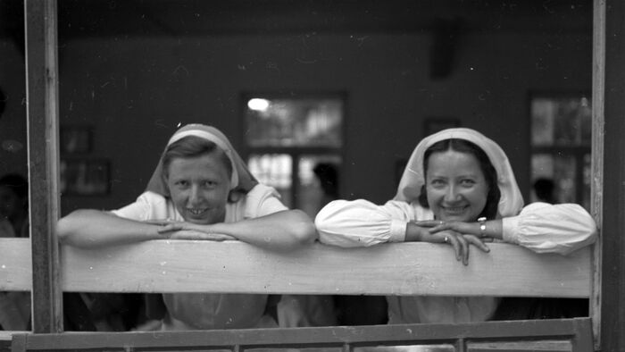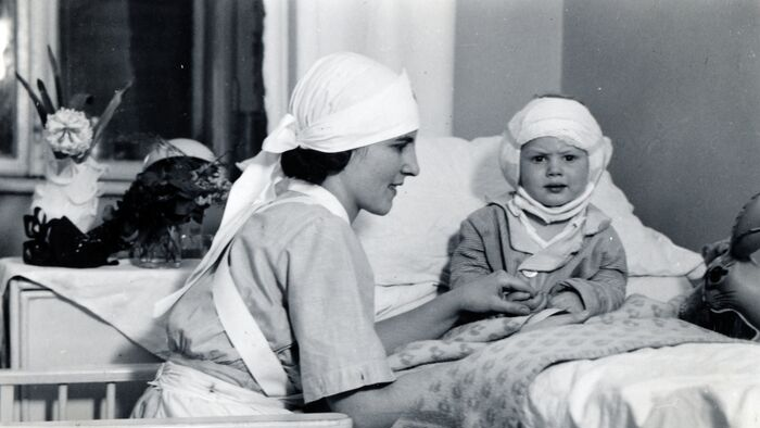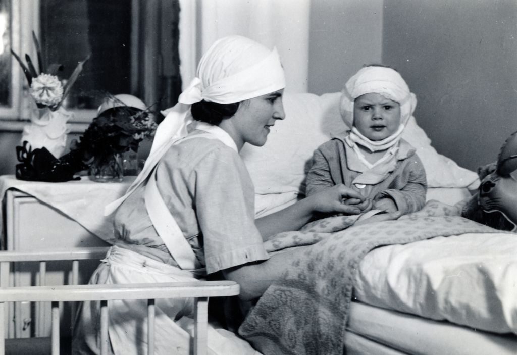 Magyarország, 1935 – Fehér ruhás ápoló egy beteg kisfiú mellett.