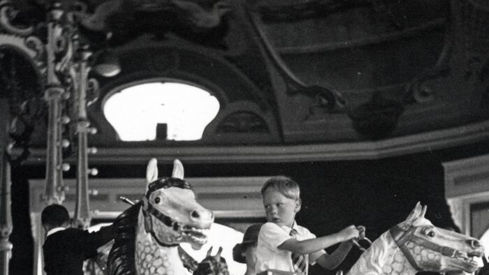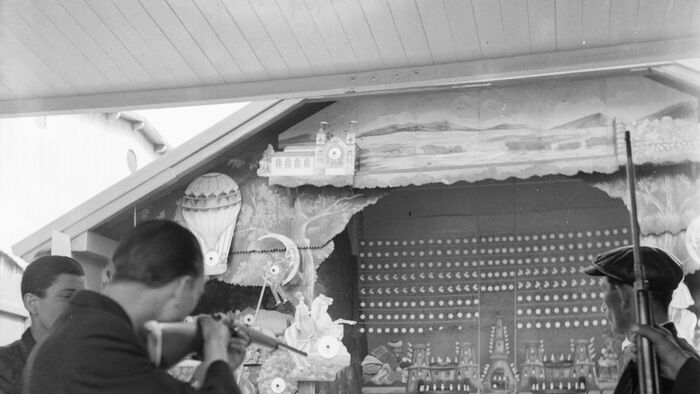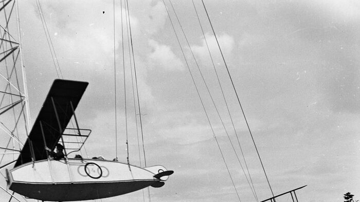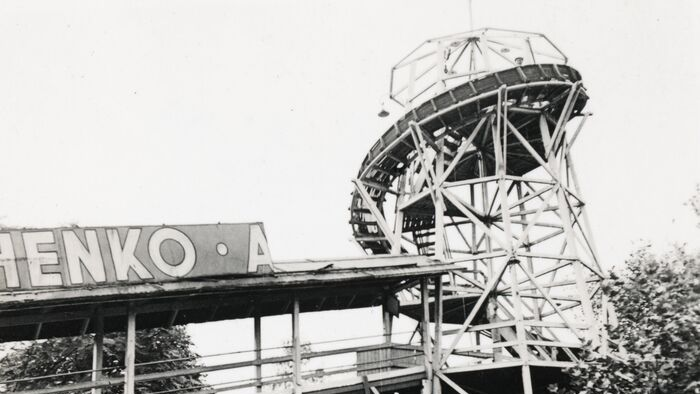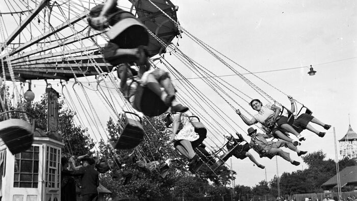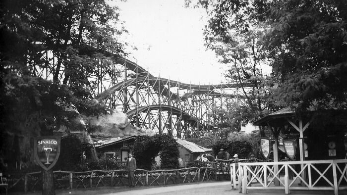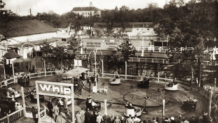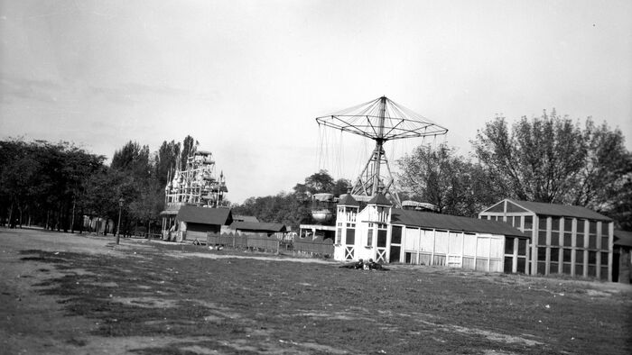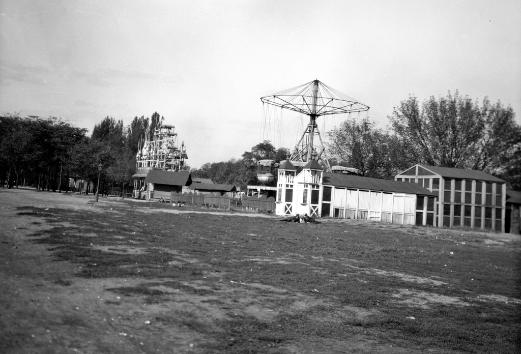 Angolpark, a későbbi hadiaréna helye. Reymetter Árpádné Aeroplán körhintája, távolabb az Angolpark első ősi óriáskereke.