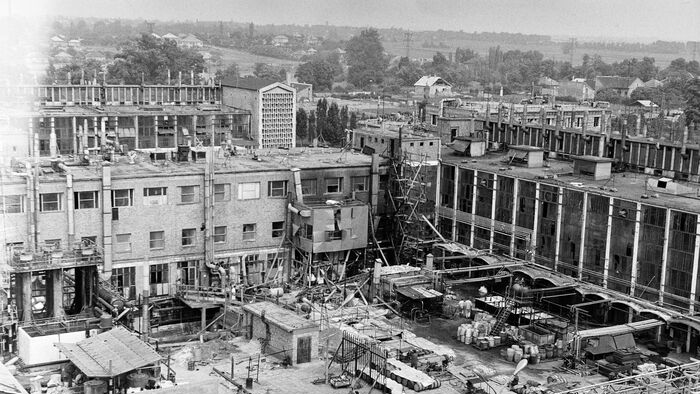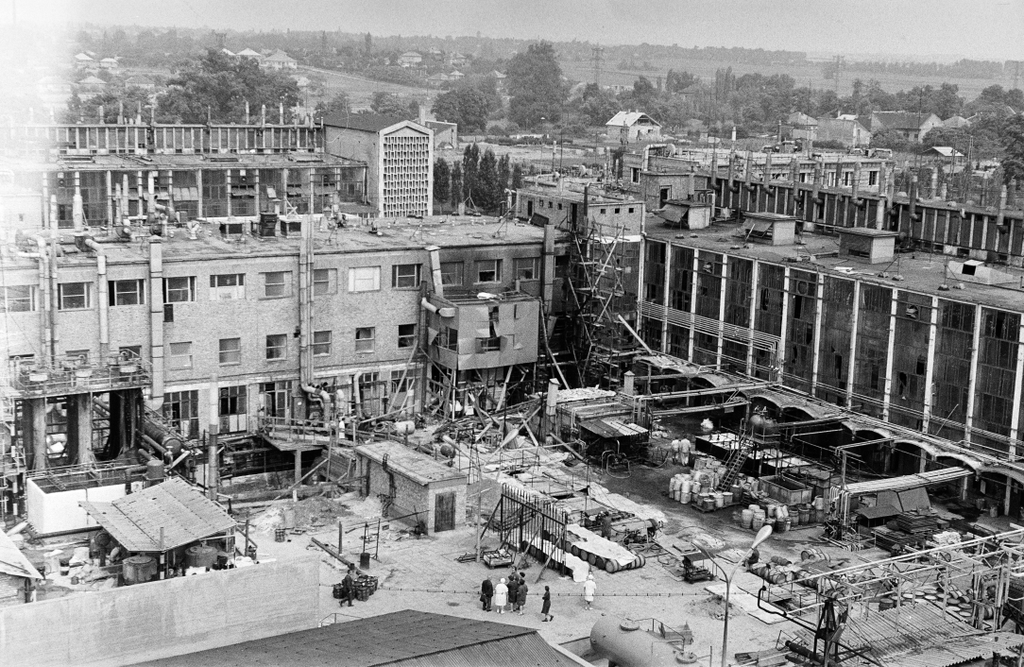 1971. Keresztúri út 30-38., Egyesült Gyógyszer és Tápszergyár, ma Egis Gyógyszergyár. A szemben látható épületen az 1971. június 22-i robbanás és tűz következményei láthatók.