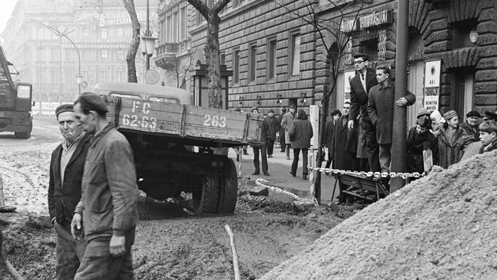 A felvétel a Teréz körút 9. szám előtt bekövetkezett víz főnyomóvezeték csőtörésekor készült, 1970. december 20-án.