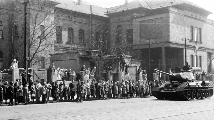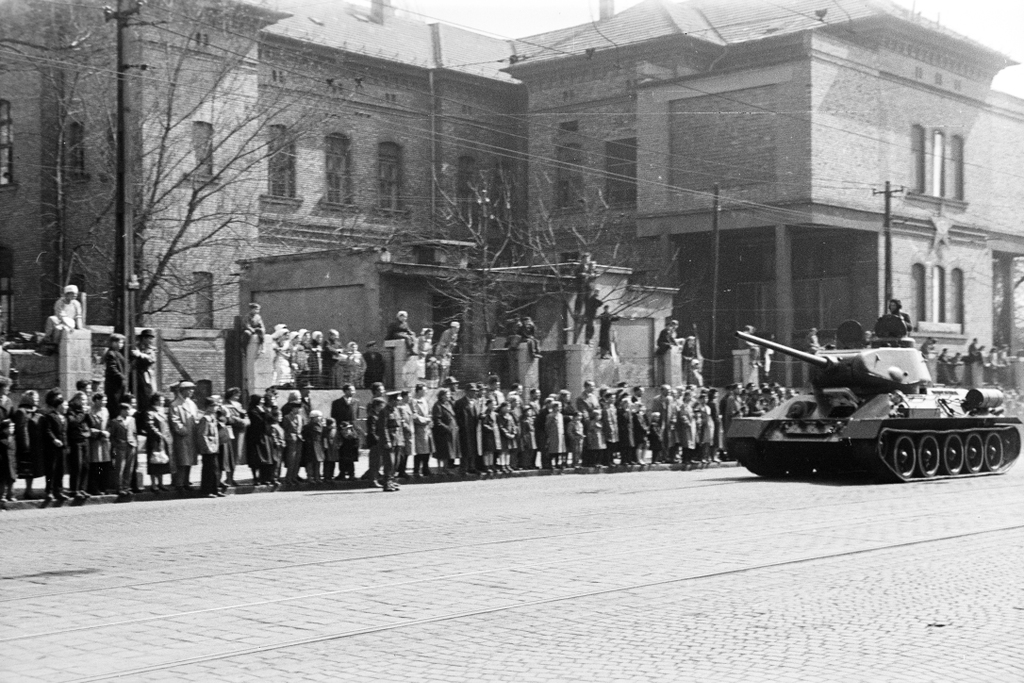 Az október 23-ák szerves részét képezte régen a dísszemle. A képen egy T 34-es tank a díszszemle után Budapesten, amint a Szabolcs utcai kórház / Orvostovábbképző Intézet épülete előtt halad el, 1961-ben.