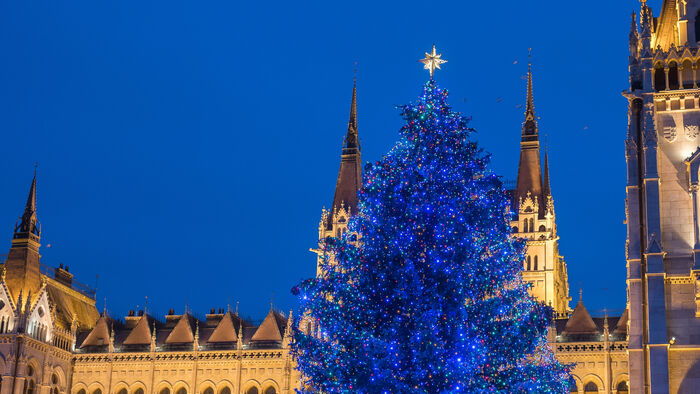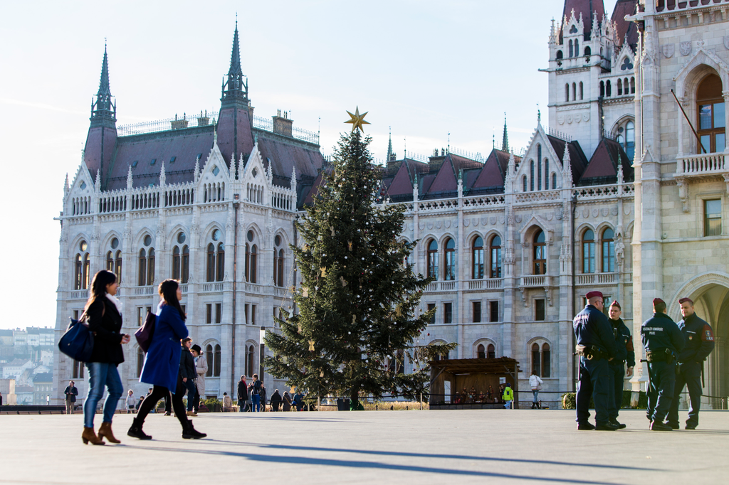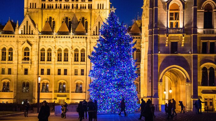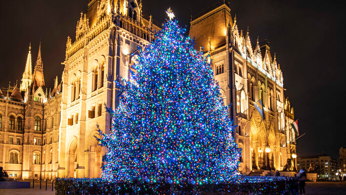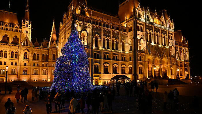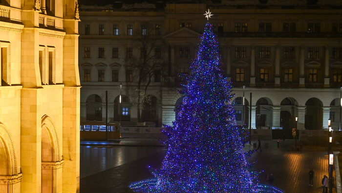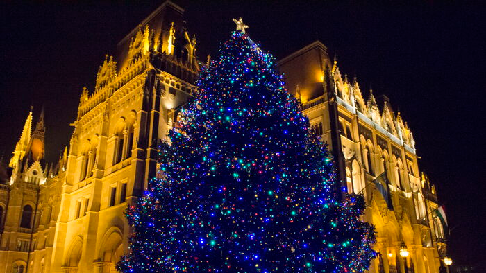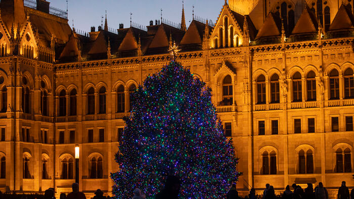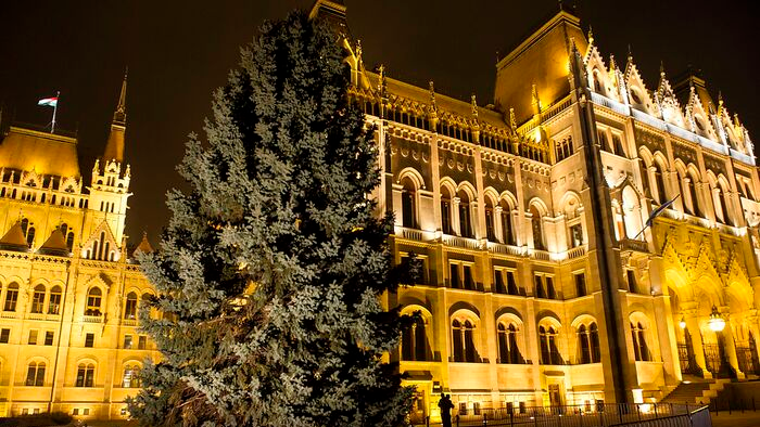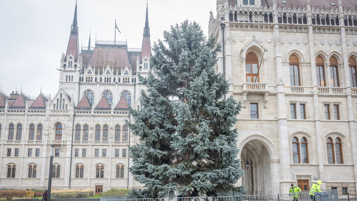 A 2014-es karácsonyfa az Országház mellett. Fotó: Mediaworks/Ancsin Gábor