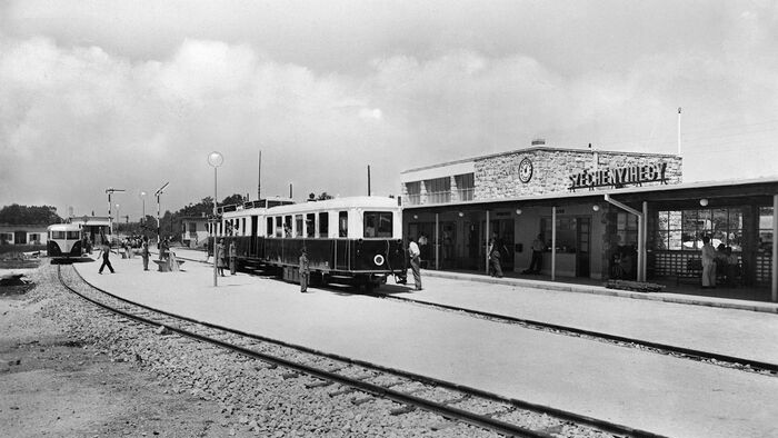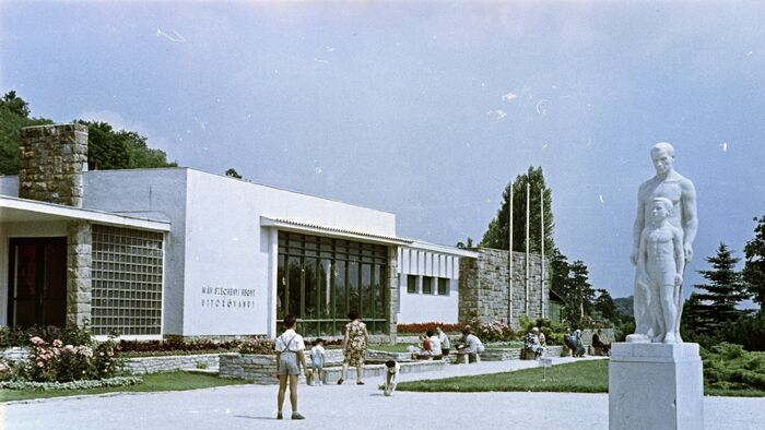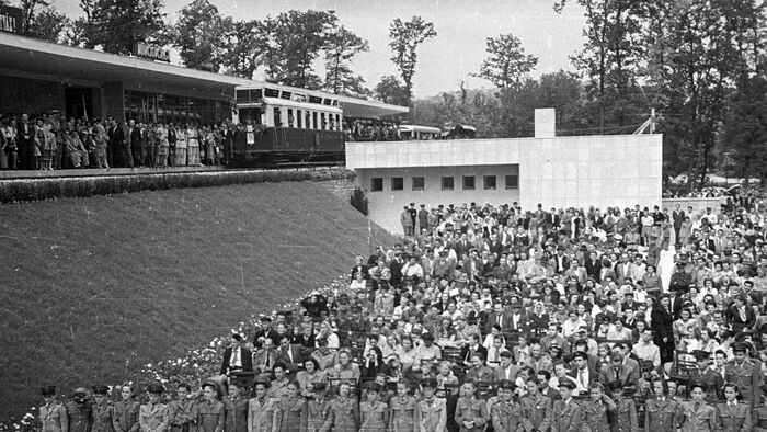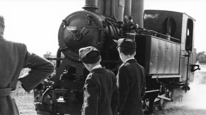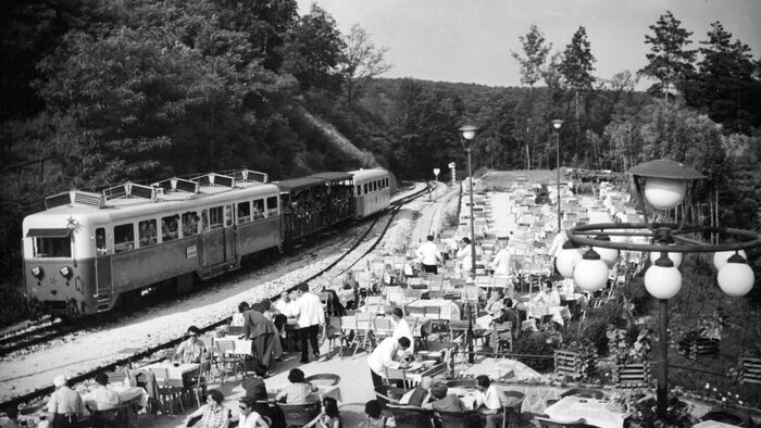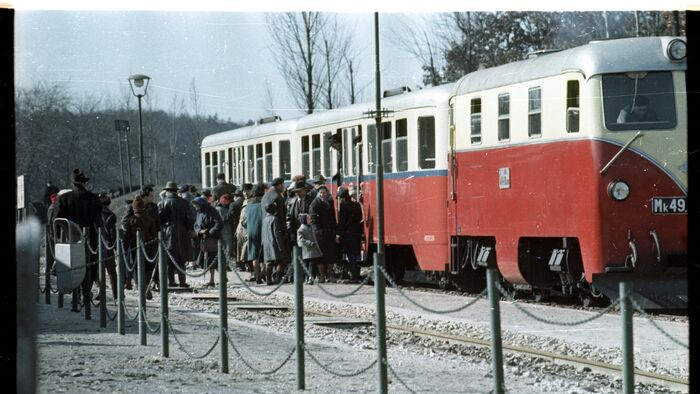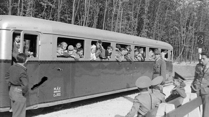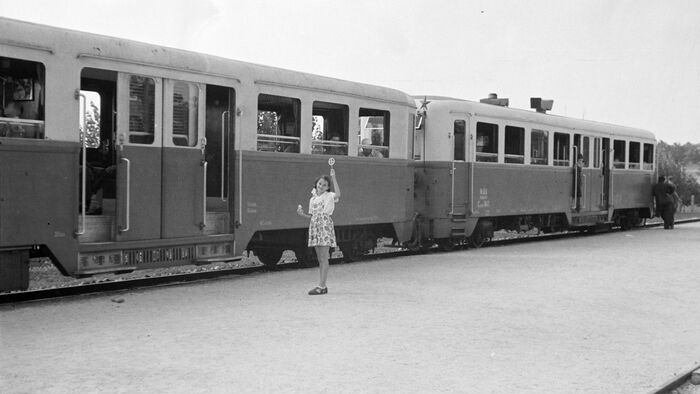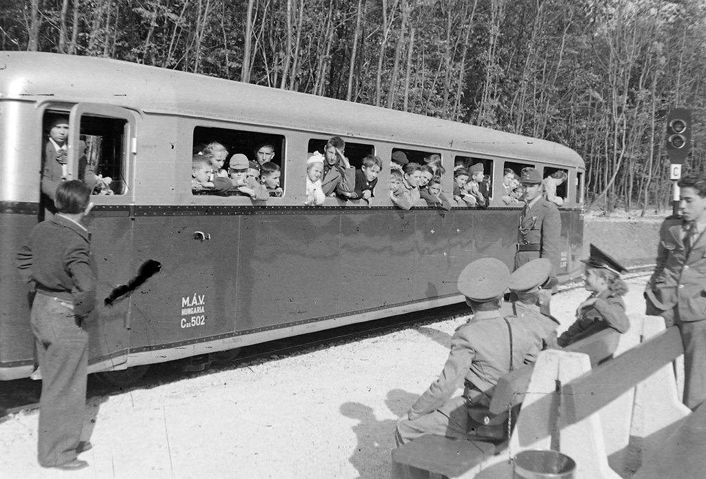 A Gyermekvasút vonalát 1948. április 11-én kezdték el építeni a Széchenyi-hegyen. A képen Csillebérc (Úttörőváros), a Gyermekvasút megállója látható.