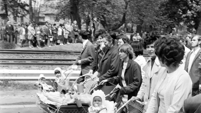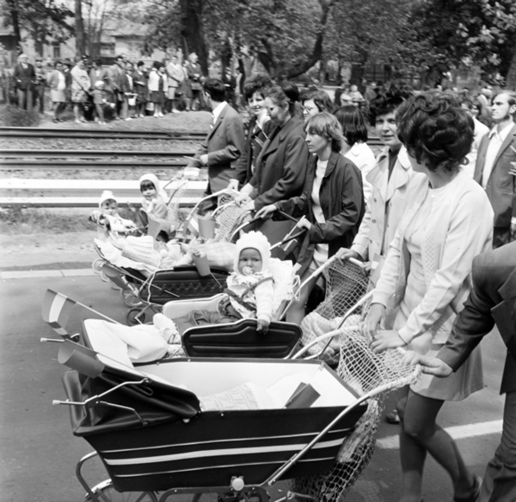 Kismamák és gyermekeik egy május 1-i felvonuláson, 1971-ben.
