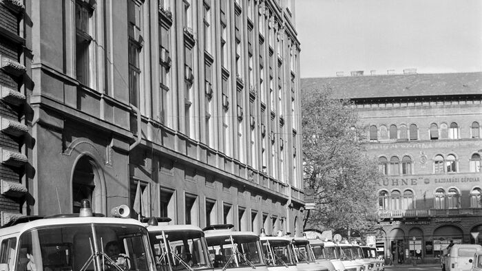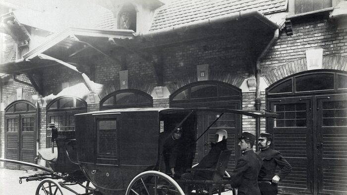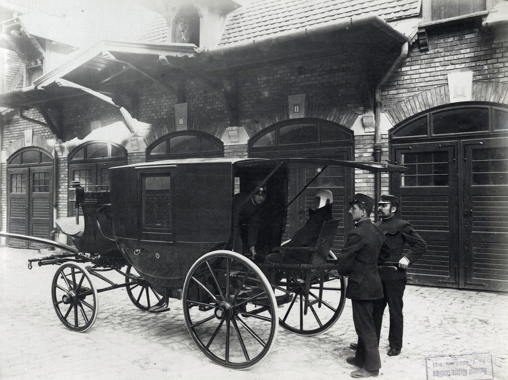 1896. Az Országos Mentőszolgálat, ekkor a Kresz Géza által megalapított Budapesti Önkéntes Mentő Egyesületet (BÖME) központjának udvara Fotó: Budapest Főváros Levéltára / Klösz György fényképei