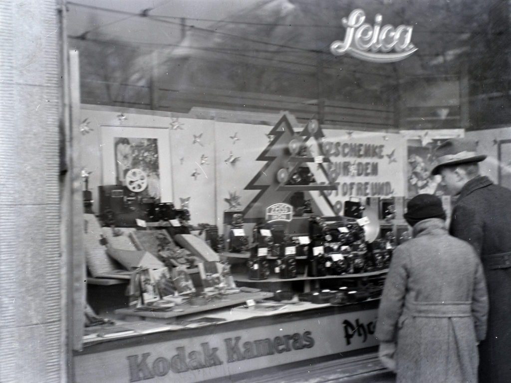Kodak és Leica fényképezőgépek a kirakatokban. A kép 1937-ben készült. Forrás: Fortepan / Révay Péter