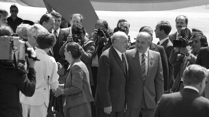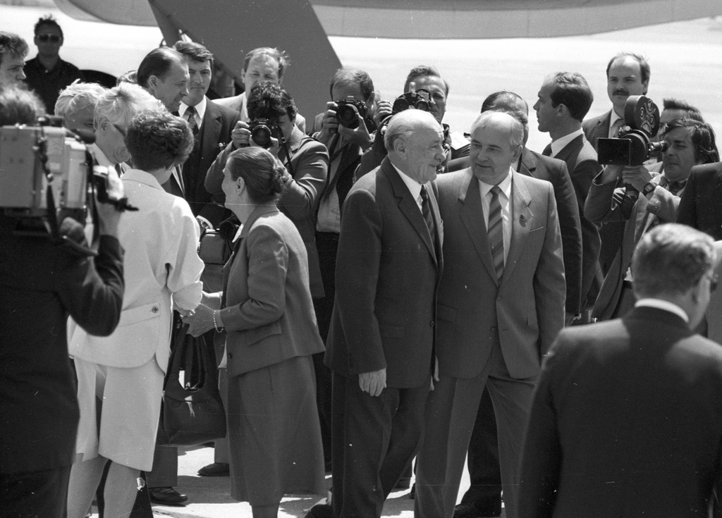 Kádár János és Mihail Gorbacsov, a szovjet pártvezető érkezésekor, 1986. június 8-án.