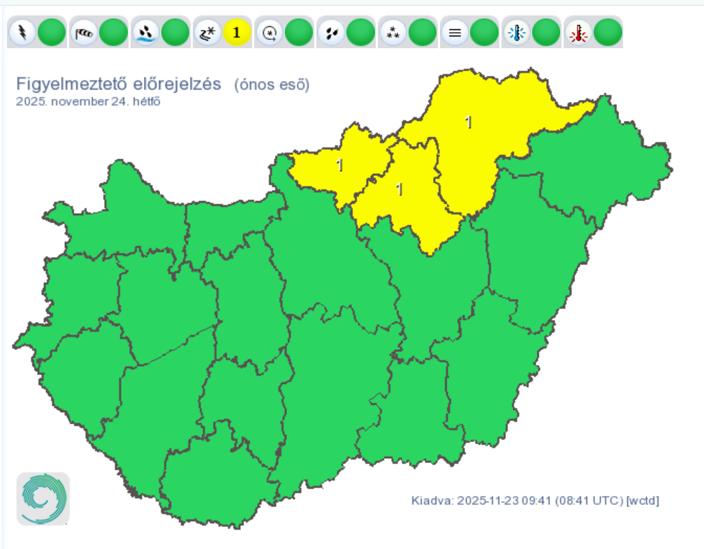 A HungaroMet Nonprofit Zrt. veszélyjelzésében három vármegyére adtak ki citromsárga riasztást: Borsod-Abaúj-Zemplén, Heves és Nógrád vármegyében gyenge ónos esőre kell majd számítani.