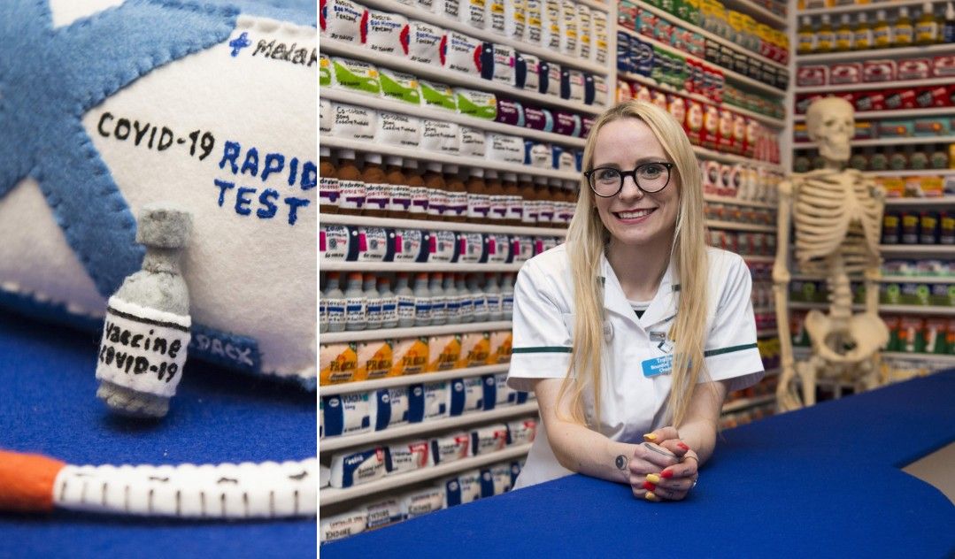 Felépítette a pultot, a polcokat, amik – épp úgy, mint egy igaziban – roskadoznak a termékek alatt. A gyógyszerektől elkezdve a higiéniás termékeken át a kozmetikumokig minden található itt, és természetesen Covid-teszt és -vakcina is. Lucy művével arra kívánja felhívni a figyelmet, hogy a gyógyszertárakban, drogériákban dolgozók éppúgy a frontvonalban dolgoznak már egy éve, mint az orvosok, ápolók.