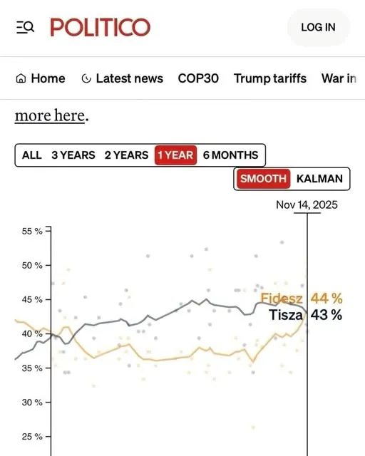 A Mandiner cikke szerint a lapnál amely a magyar kutatások alapján tesz közé összesítést, korábban a legfőbb kihívó, a Tisza Párt előnyét mutatta, ám már 44-43 arányban a Fidesz vezetését mutatta ki a kutatás eredménye egy november 14-i adat szerint. „A Politico nem szeret minket. De már a Politico szerint is vezetünk. Mekkora lehet akkor az előnyünk valójában” – reagált a számokra a Facebook-oldalán Menczer Tamás, a Fidesz–KDNP kommunikációs igazgatója.