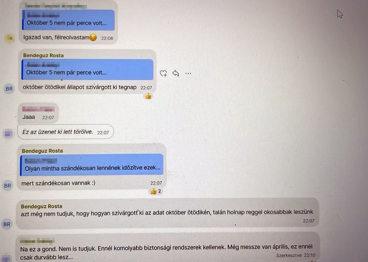 A Magyar Nemzet exkluzív cikkben árul el információkat: kiderült miről beszélgettek a tiszás informatikusok és a többiek a zárt Signal-csoportban vasárnap este. A beszélgetés lényege akkor indult el, mikor a tiszások meglátták azokat a cikkeket, amelyek a 200 ezer nevet érintő adatszivárgásról szóltak. Ekkor a Tisza párt vezető informatikusa, Rosta Bendegúz osztott meg bennfentes információkat a csoport tagjaival.