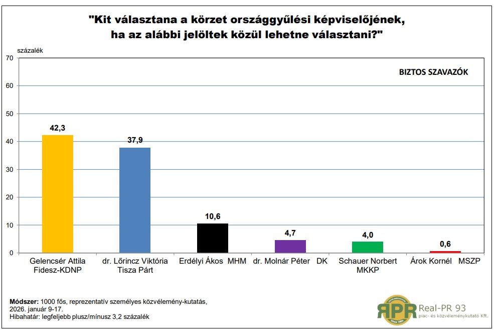 A vidék kutatója, a Real-PR 93 2026 januárjában 1000 fős, személyes kérdezésen alapuló felmérést készített Somogy vármegye 1-es választókerületében, amelynek Kaposvár a székhelye. A választókerületi felmérés eredménye visszaigazolta az országos trendeket. A Real-PR 93 múlt év decemberi országos kutatása a biztos szavazók bázisán 11 százalékpontos Fidesz-előnyt azonosított, amely a 2022-esnél 5 százalékponttal kevesebb. Ugyan a Fidesz 2026-os választási győzelme a kutatás alapján nagyon valószínű, négy évvel ezelőtti országos előnyének közel harmadát elvesztette a kormánypárt új kihívójával szemben.