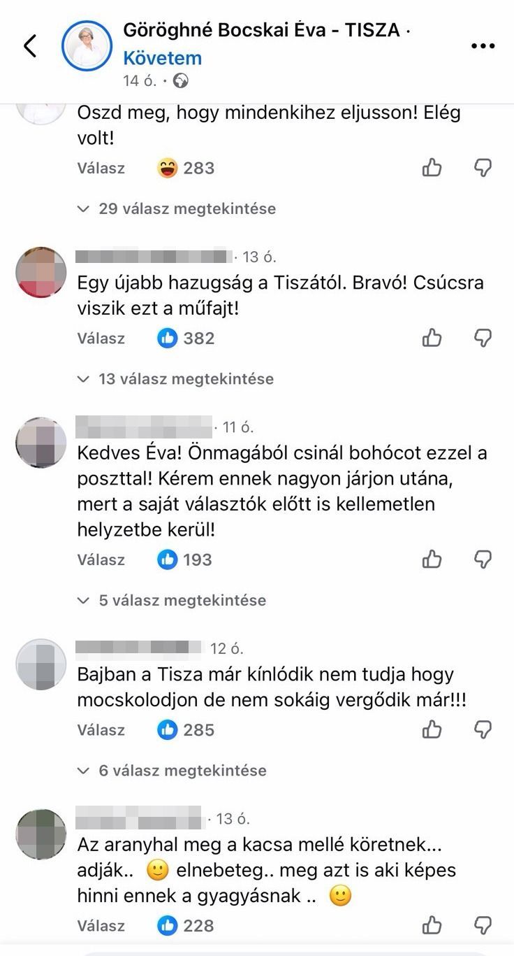 Miután a képviselőjelölt megosztotta az újabb hazugságát, szinte azonnal özönleni kezdtek a negatív kommentek a posztja alá. Volt aki kellemetlennek nevezte ezt az egészet és szerinte bohócot csinált magából a tiszás jelölt, de akadt olyan is aki egyenesen gyagyásnak hívta Göröghné Bocskai Évát.