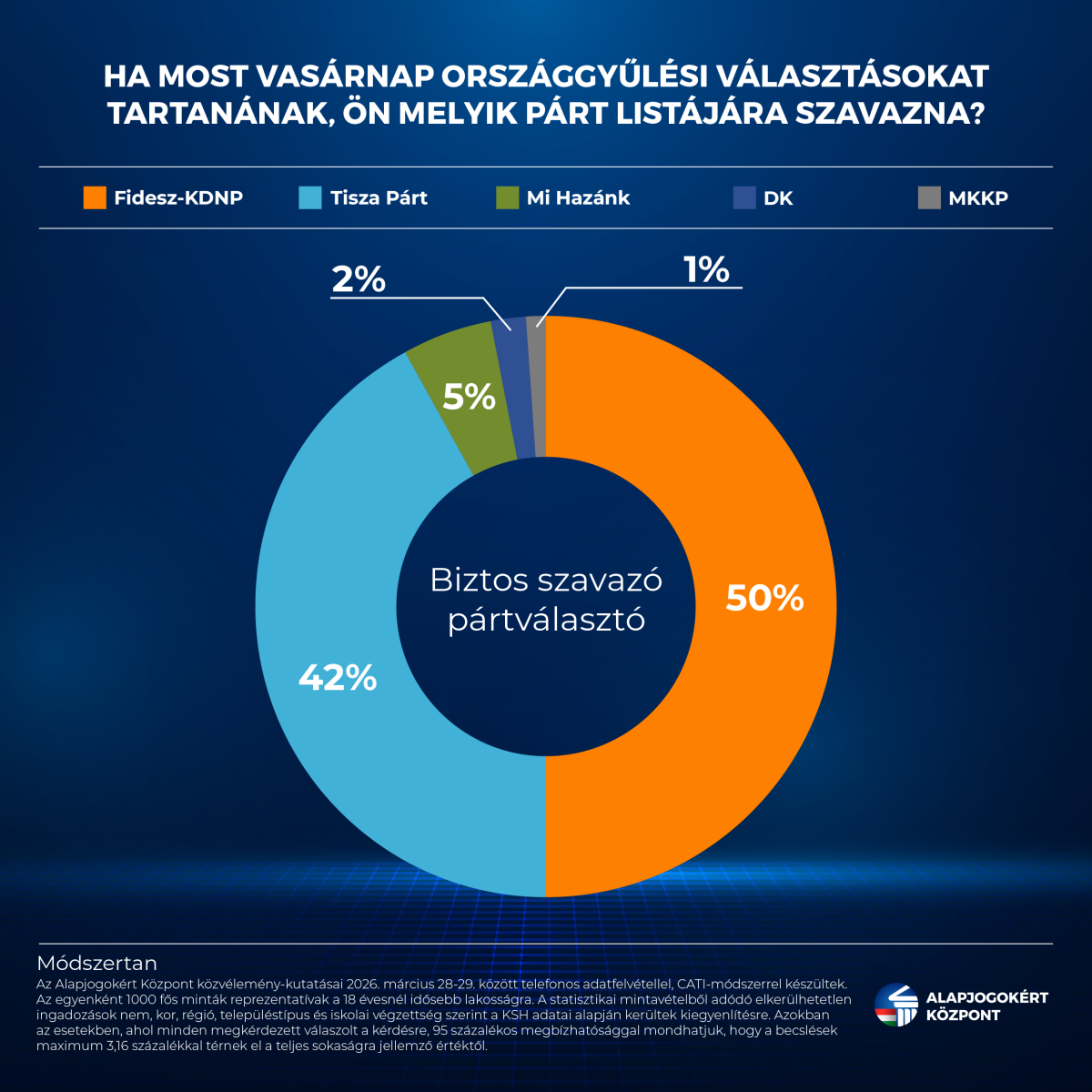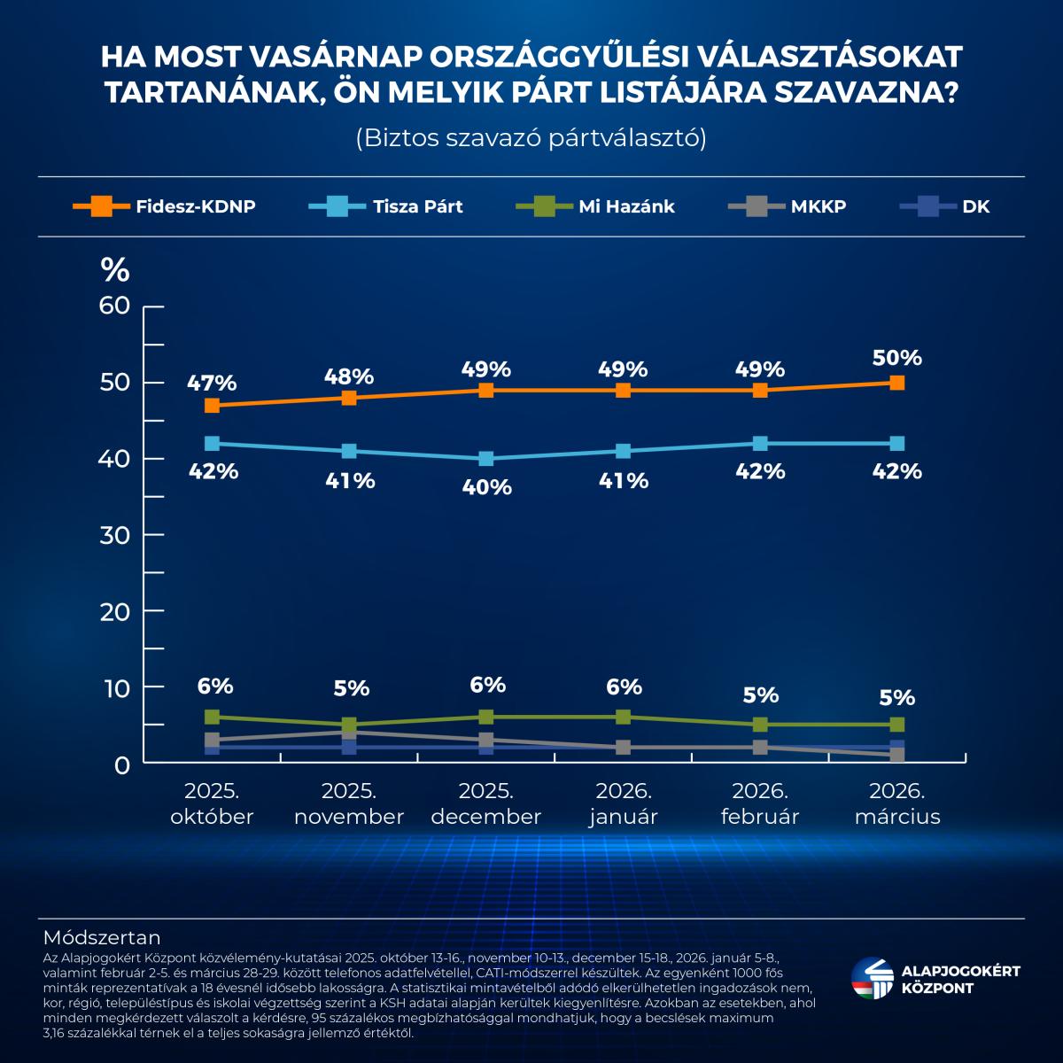 Módszertan: az Alapjogokért Központ közvélemény-kutatásai 2025. október 13-16., november 10-13., december 15-18., 2026. január 5-8., valamint február 2-5. és március 28-29. között telefonos adatfelvétellel, CATI-módszerrel készültek. Az egyenként 1000 fős minták reprezentatívak a 18 évesnél idősebb lakosságra. A statisztikai mintavételből adódó elkerülhetetlen ingadozások nem, kor, régió, településtípus és iskolai végzettség szerint a KSH adatai alapján kerültek kiegyenlítésre. Azokban az esetekben, ahol minden megkérdezett válaszolt a kérdésre, 95 százalékos megbízhatósággal mondhatjuk, hogy a becslések maximum 3,16 százalékkal térnek el a teljes sokaságra jellemző értéktől.