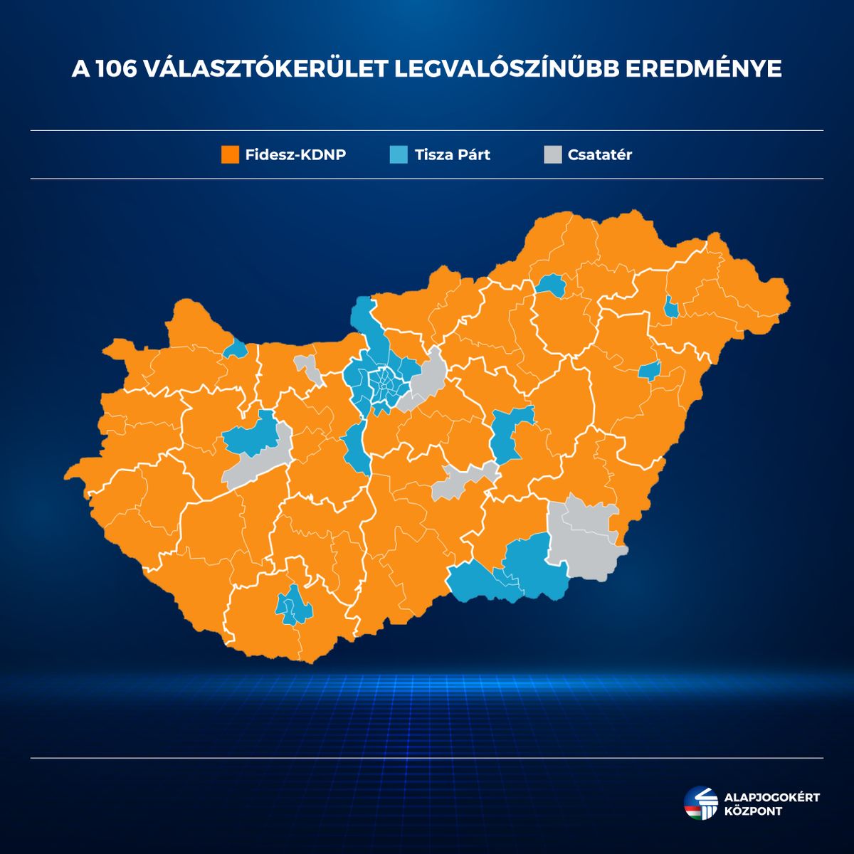 A mandátumelosztási becslés alapját egy választókerületi szintű, többváltozós értékelési modell képezi, amely – a jelenlegi választókerületi határokat figyelembe véve – a 2022-es országgyűlési választás egyéni és listás eredményeit, a két adatsor közötti eltérést, a 2024-es európai parlamenti és önkormányzati választás adatait, a körzetek politikai megtartottságát, valamint a legfrissebb választási indikátorokat – többek között helyi közvélemény-kutatásokat – integrálja egy egységes pontozási rendszerbe, figyelembe véve az adott választókerület szocidemográfiai tényezőit, az elmúlt években azonosítható helyi politikai folyamatokat és természetesen a 2022 előtti választástörténeti előzményeket is. Az így előálló összpontszám lehetővé teszi a 106 egyéni választókerület rangsorolását és kategorizálását „Fidesz-KDNP”, „csatatér”, „Tisza”, valamint „egyéb ellenzéki körzetek” szerint.