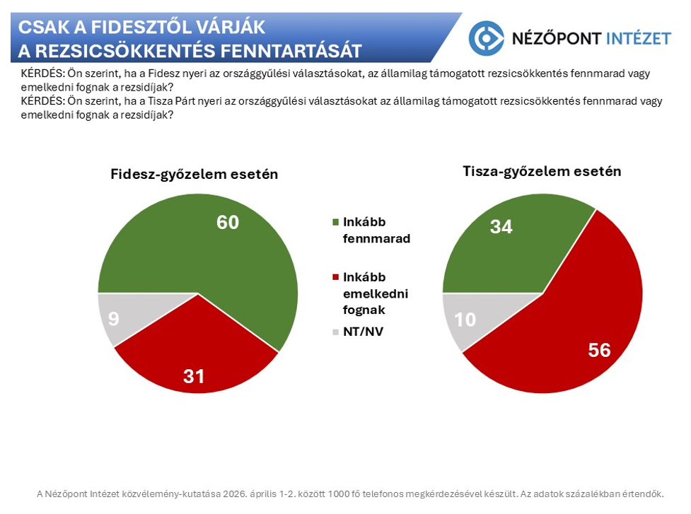 A magyarok szinte ugyanilyen mértékben (60 százalék) gondolják azt, hogy választási győzelme esetén a Fidesz viszont fenntartaná a rezsicsökkentést.